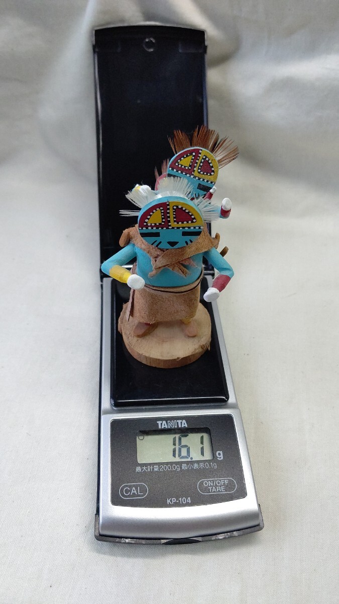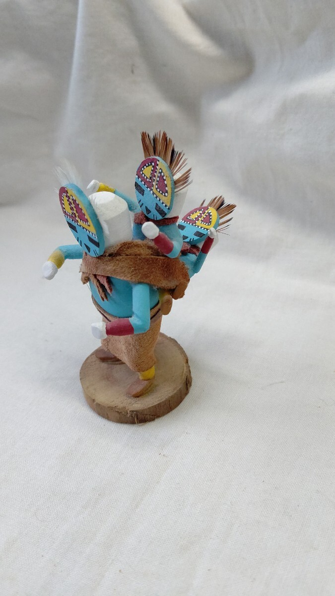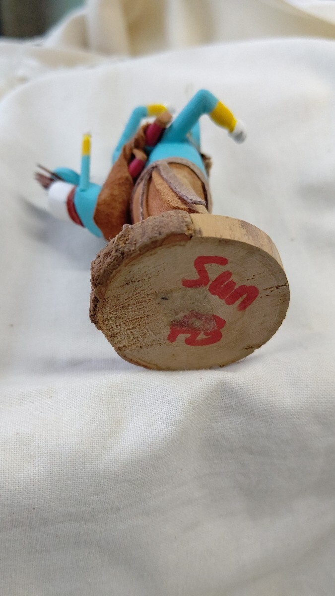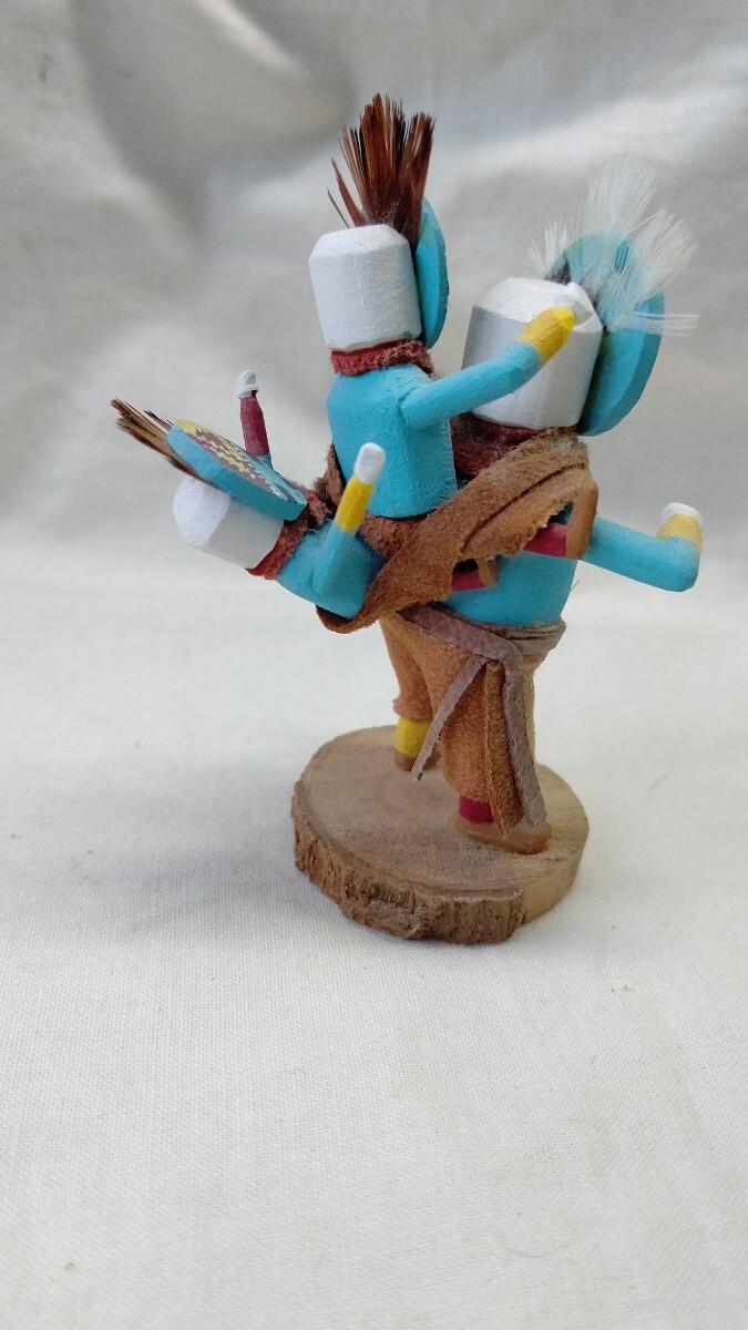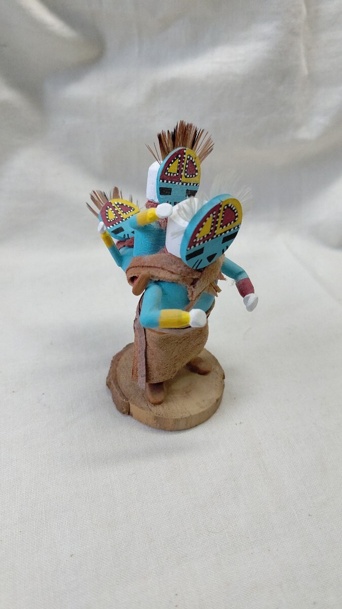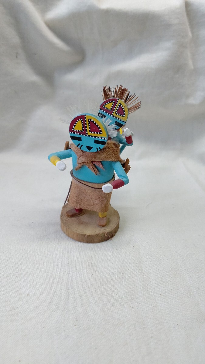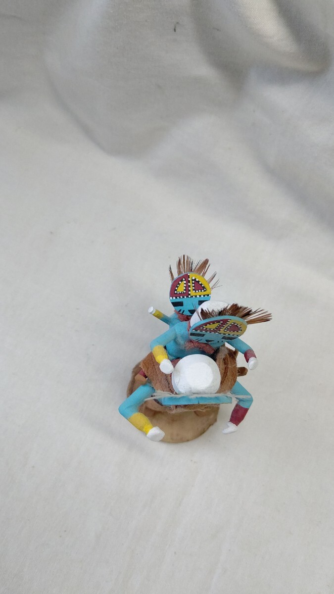 ホピでは10歳ころに成人男性のイニシエーションを受け、結社のメンバーになった者だけがカチナの儀式に参加することができ、カチナを彫ることが許される。カチナは、精霊の姿を現す分身として、ホピ族の儀式で使われる伝統的な人形で、台座のついたものは芸術性の高いコレクションピースになります。トレーディングポストで、材料となるコットンウッドの根を購入して、削りと彫り、そして着色も1人でおこない、顔も衣装も伝統的な精霊像とそっくりにしなければならないが、微妙な表情やスタイルには作り手の個性を出しても良いそうです。