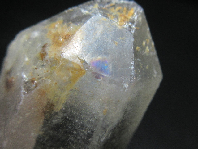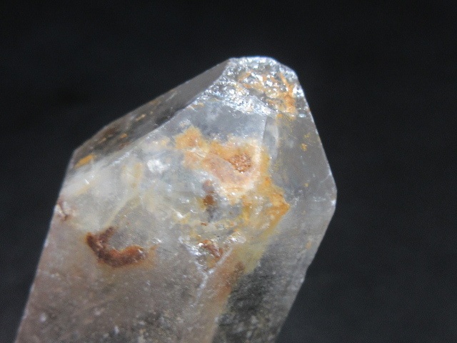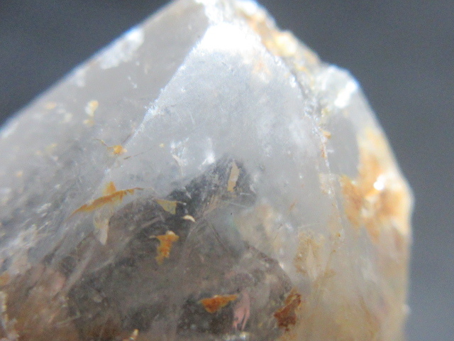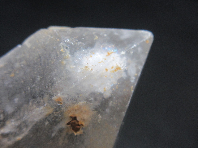 ・シチュアンでは長手の形状で、いくつかの表面に褐色鉱物の外包が見られる水晶です。 内部には、白色鉱物の内包、黒色幻影(ブラックファントム)、そしてレインボーが見られます。