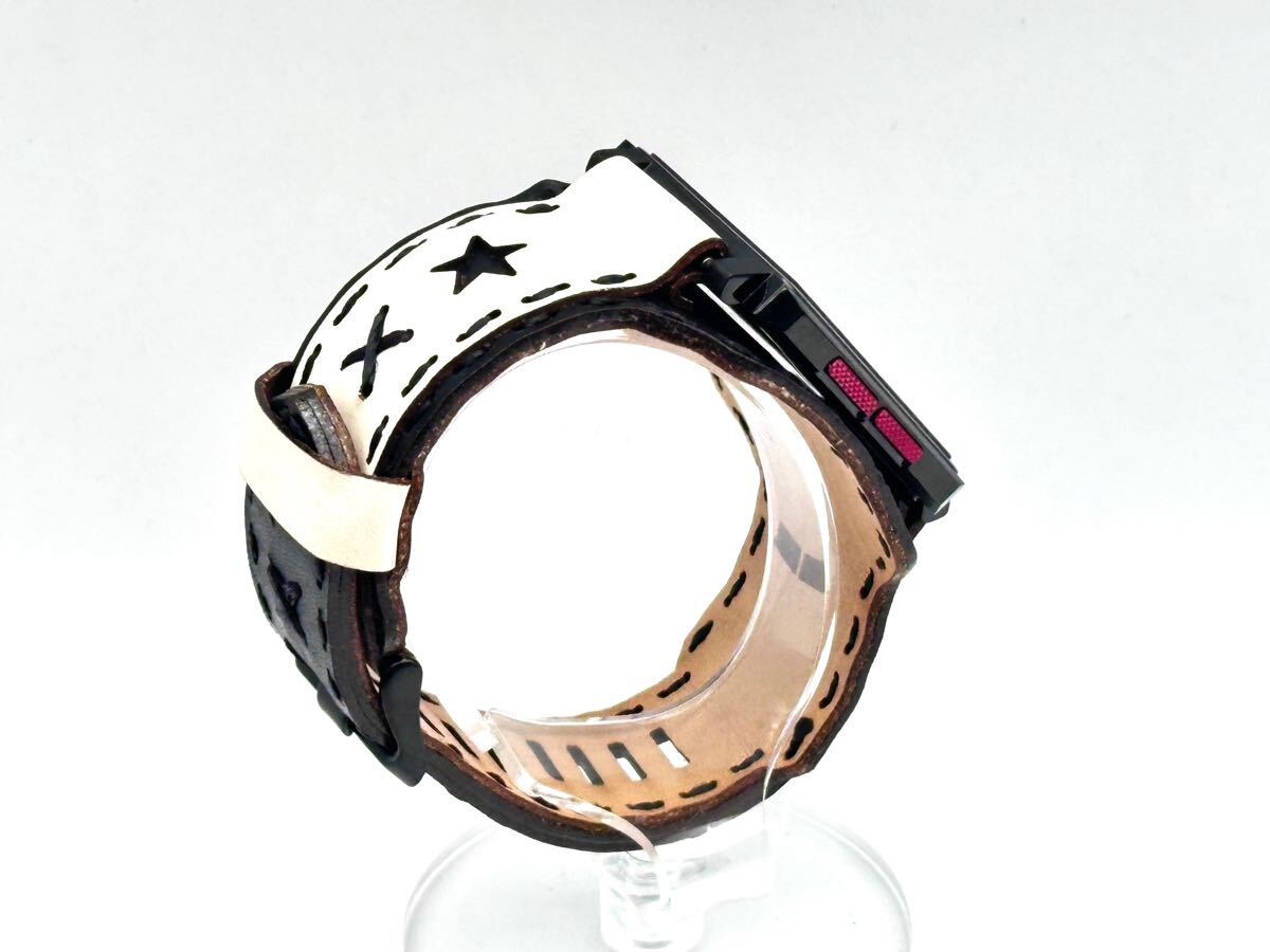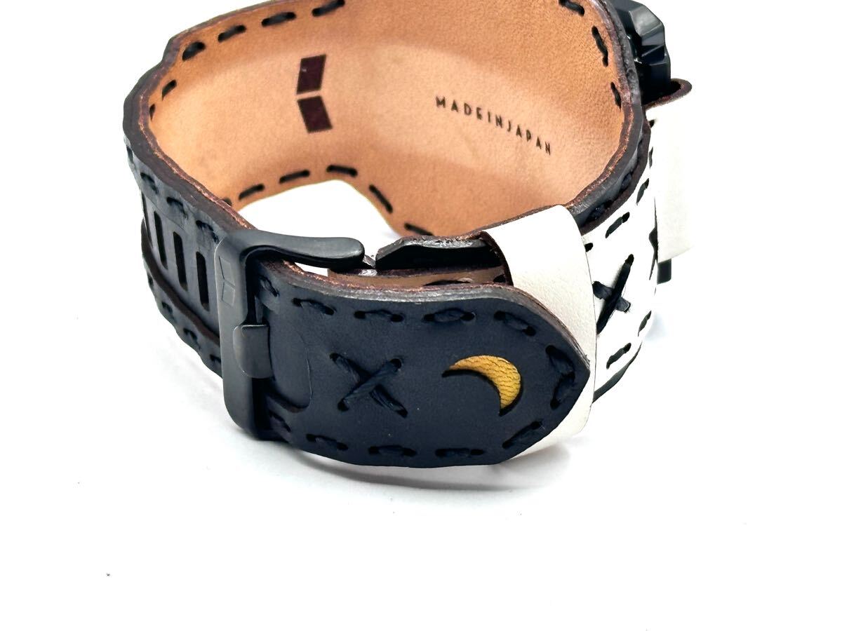 本革仕様のベルト部分は配色と星形、月のモチーフが目を惹きます。 さらにハンドステッチならではの温もり。