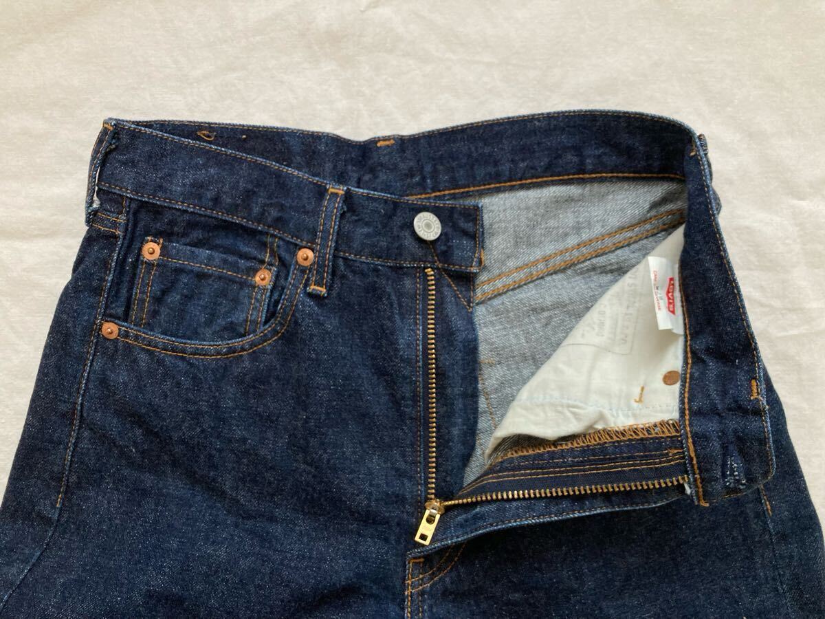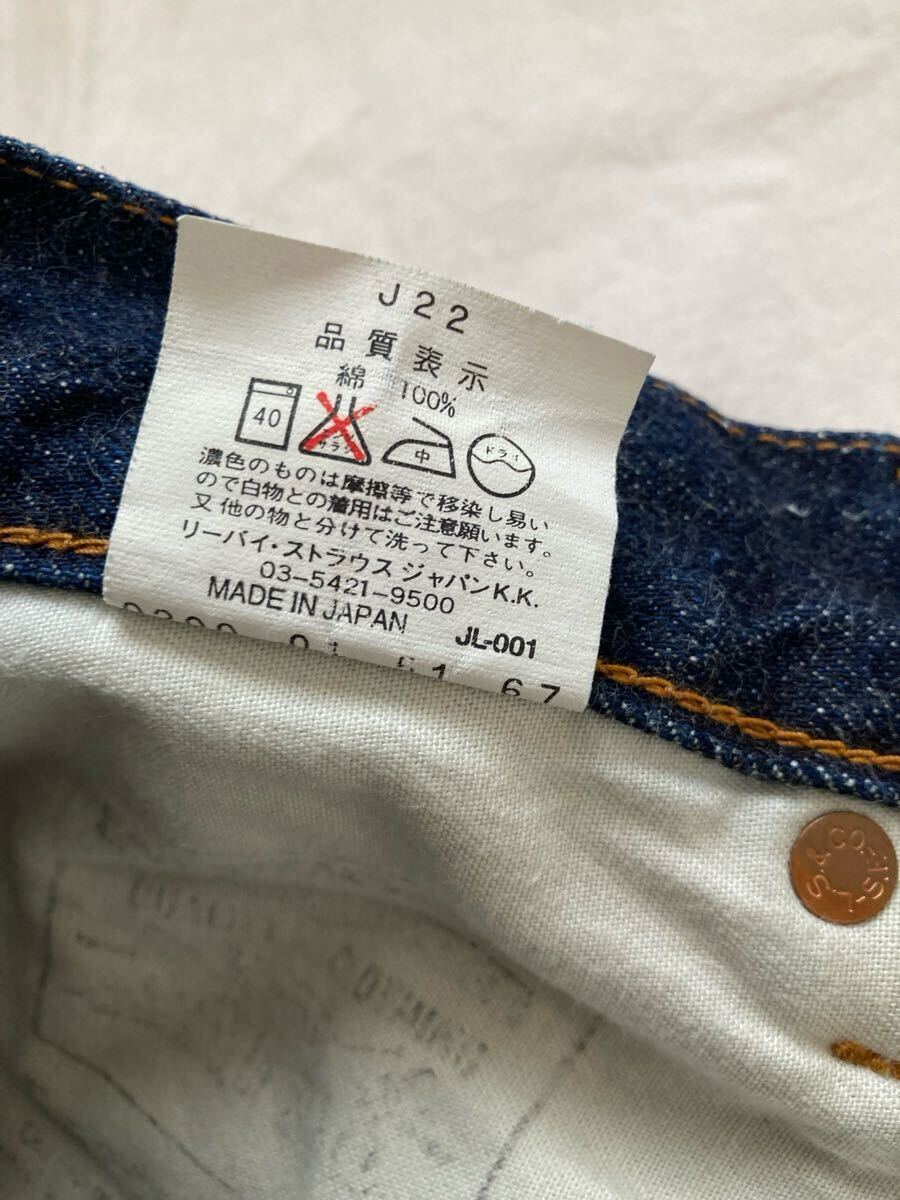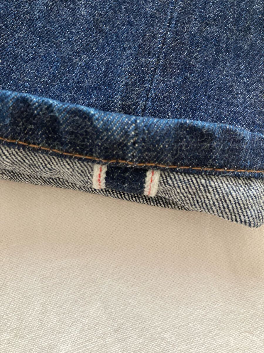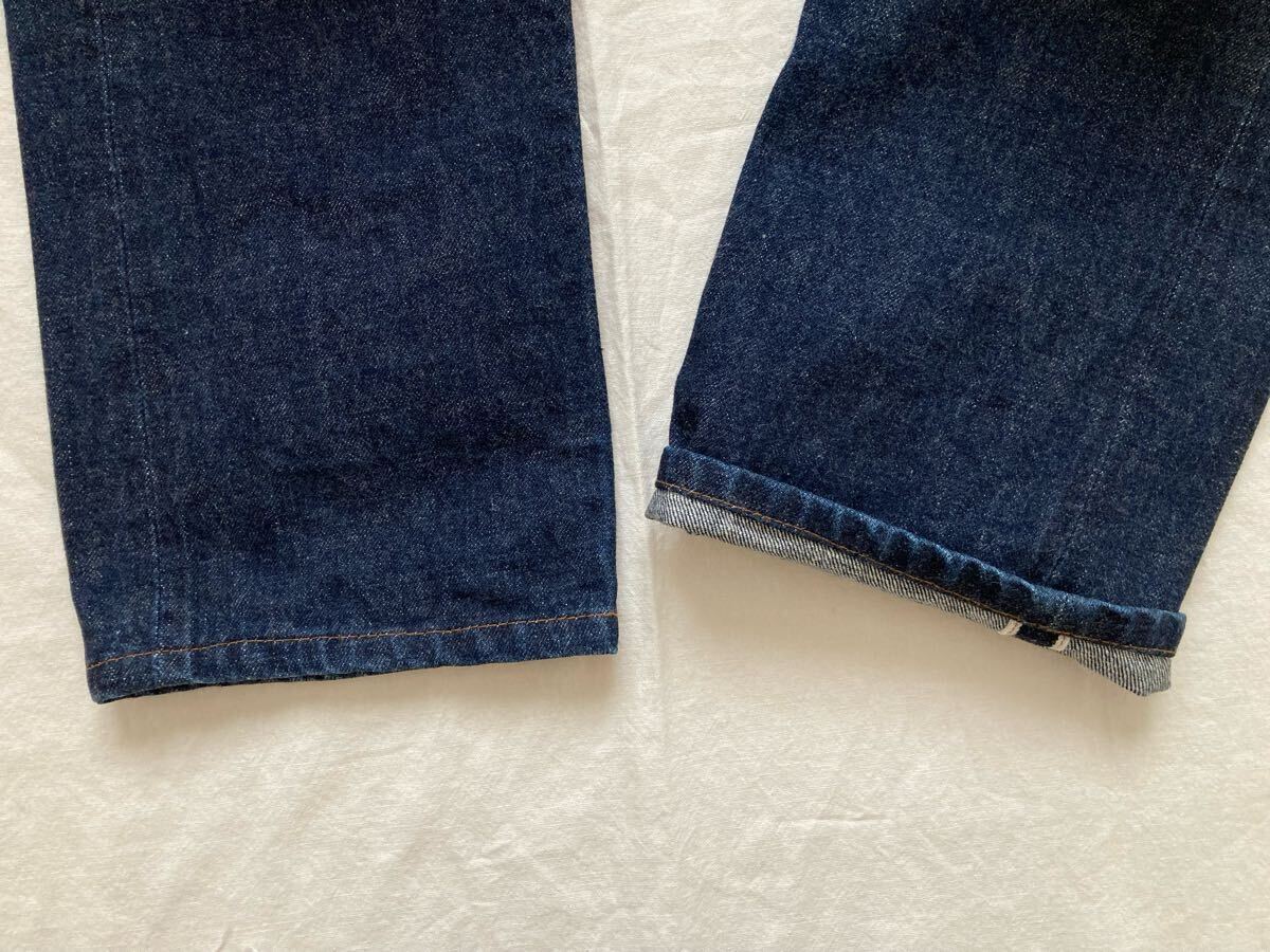 色合いはインディゴ 、綿素材です。ボタン裏J22、日本製、TALONジップ、両面ビッグE、赤耳、裾はシングルです。
