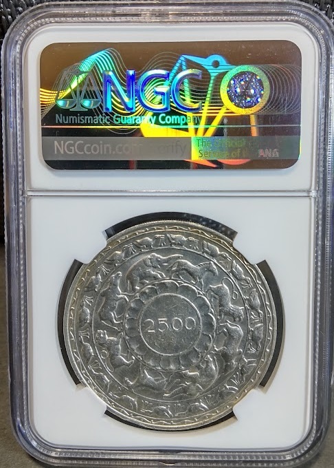 備考:1957年、イギリス領セイロン(現スリランカ)で仏教の2500周年を記念して発行されました。デザインには仏教に関連する象徴が多く含まれていて、中央の数字「2500」の周囲には蓮の花、その外側には象や馬、牛、ライオンなどの動物が描かれており、仏教の輪廻を表しています。さらに、外側には「ハンサ」というヒンドゥー教に伝わる神鳥の模様もあしらわれています。