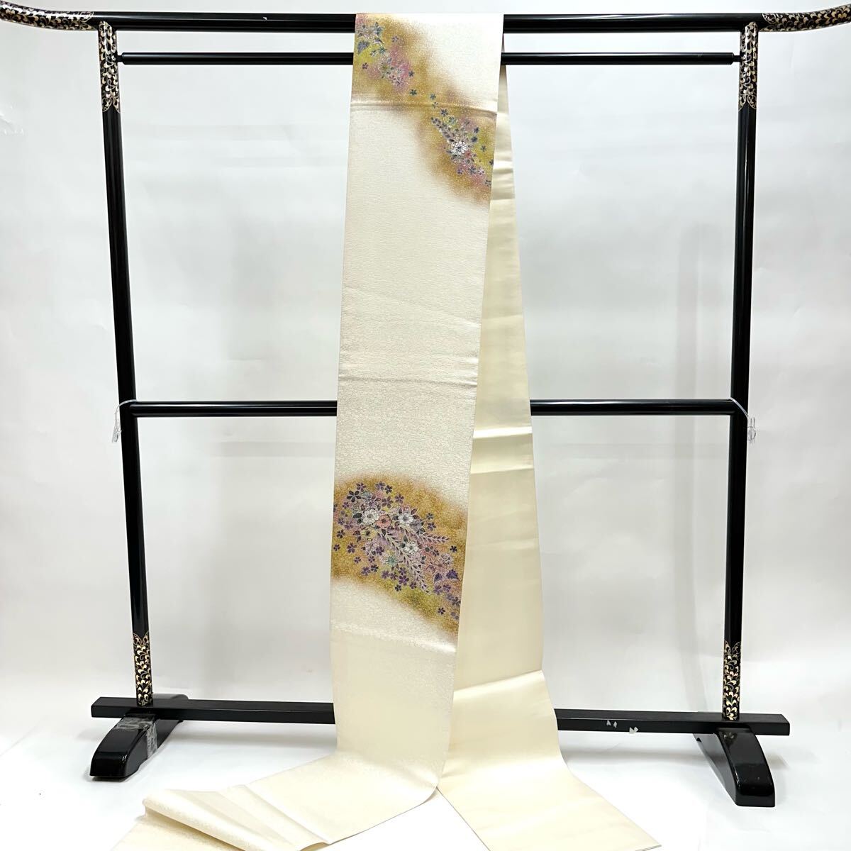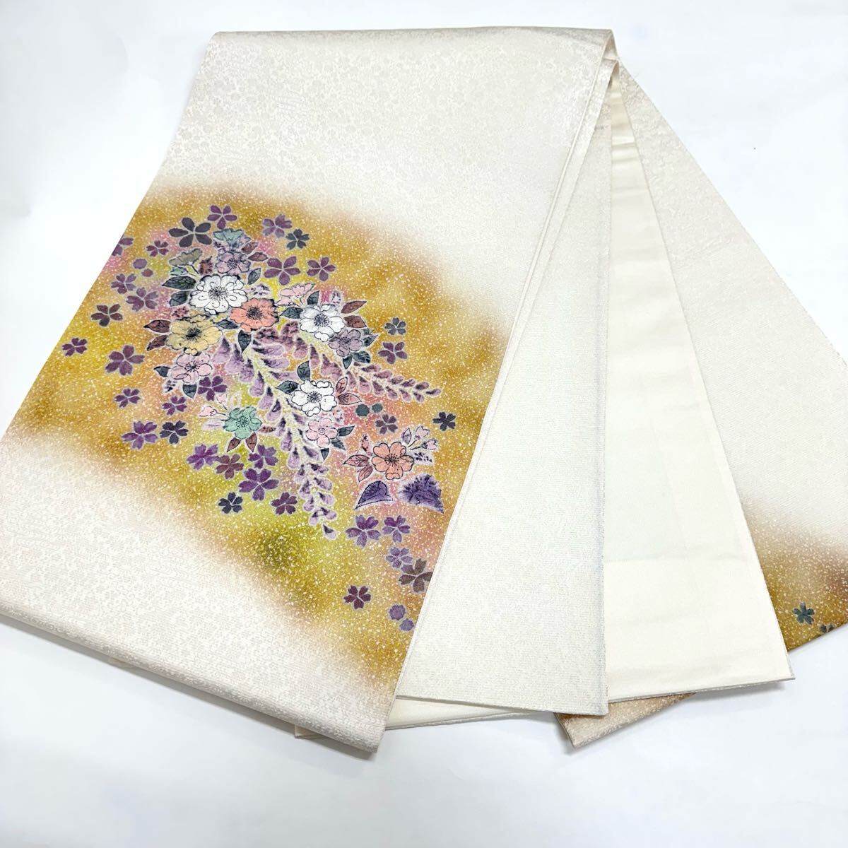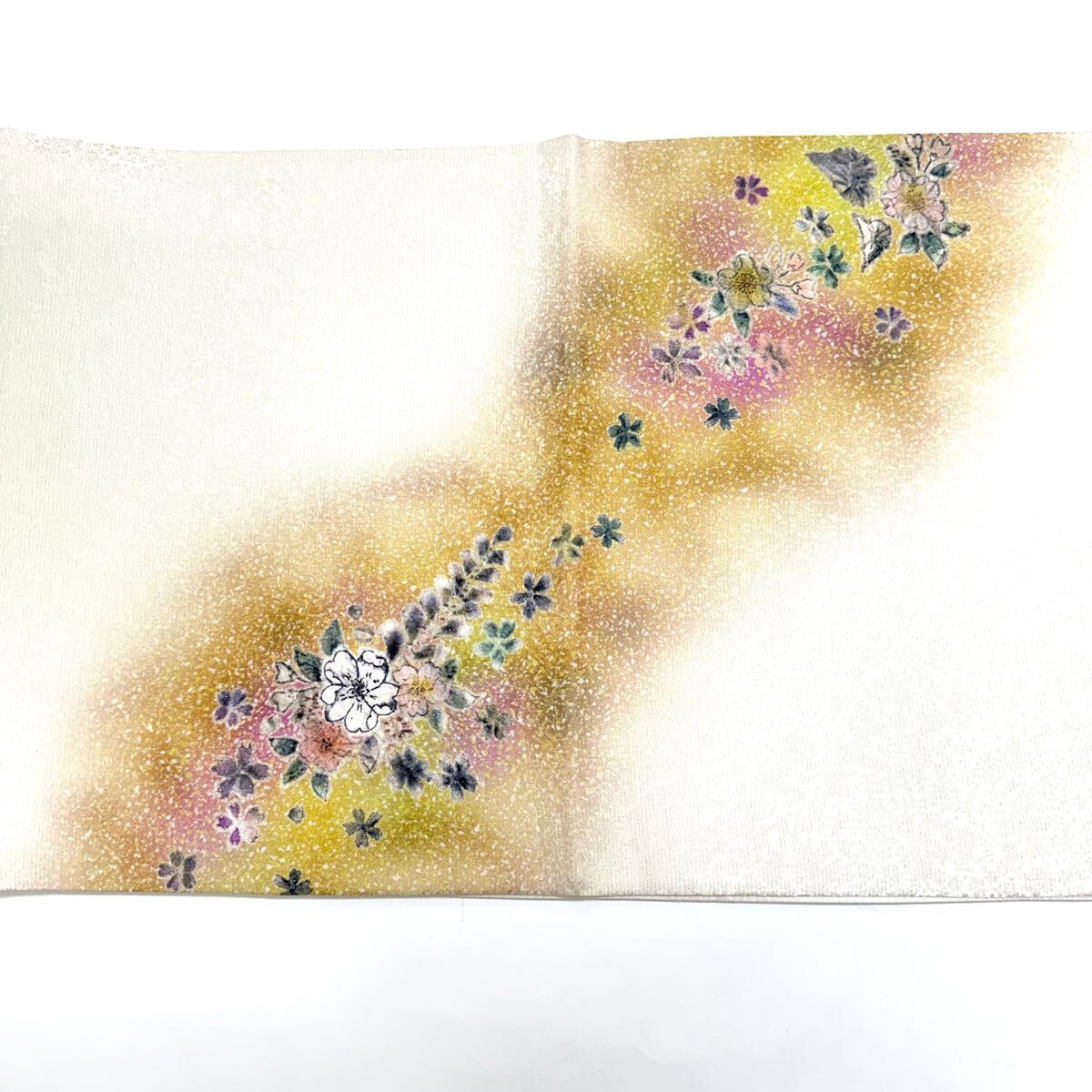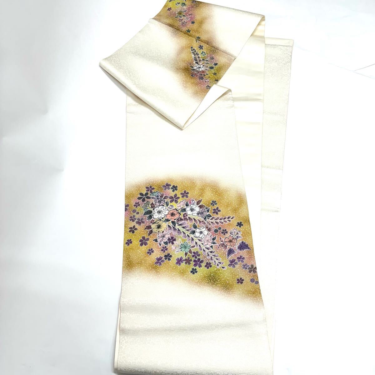【七福】c536 逸品 高級品 正絹 袋帯 太鼓柄 草花 辻が花 銀通し 豪華