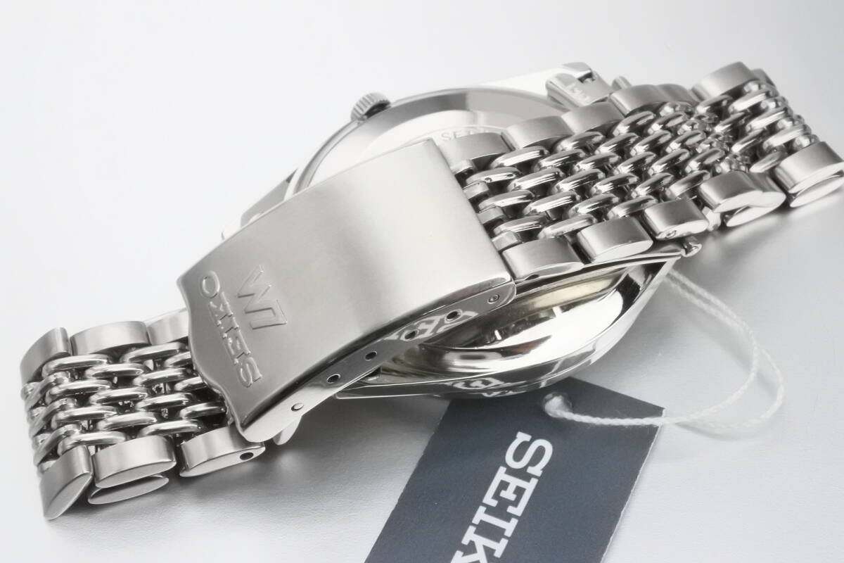 「ロードマチック 5601-9000」です。1960年代〜70年代に生産されたセイコーの代表コレクション。高度成長期真っ只中の活気溢れる時代に誕生し、当時の『グランドセイコー』、『キングセイコー』に次ぐ準高級機として人気を博しました。本品は56系と呼ばれる諏訪工場製の優秀な機械を搭載したワンピースケースモデルです。文字盤はヘアライン仕上げのシルバーカラー。バーインデックスとドルフィンハンドの組み合わせ。ノンデイト、中三針の上質な風貌デザインです。SSケースはラウンド型。裏蓋はケースが一体型となったワンピース構造です。スナップバック式やスクリューバック式の裏蓋の時計と比較して密閉性が高くなっています。バンドは社外製のSSブレスレットを装着しています。飽きの来ないデザインで実用性に富んだ国産アンティークの魅力が詰まった逸品です。