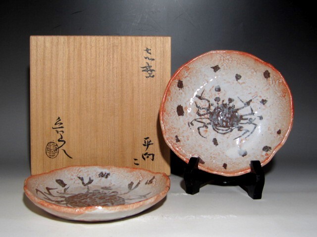 ○商品説明○ 北大路魯山人作の志野蟹絵平向二客です。 蟹の絵付けが味わい深い作品です。 ○北大路魯山人(きたおおじろさんじん)1883-1959○ 陶芸家。京都上賀茂出身。 近代美術史の中でも異色の芸術家で、篆刻家・画家・陶芸家・書道家・漆芸家・料理家・美食家などの様々な顔を持っている。 大正期に「美食倶楽部」「星岡茶寮」を創業し、使用するすべての食器を創案製作。以後ひたすら陶芸に没頭する。 織部焼の重要無形文化財保持者(人間国宝)に指定されるも辞退。 ○サ イ ズ○ 直径16~16.5cm/高さ2.8~3.5cm(多少の誤差はお許しください) ○状 態○ 無疵である事は確認しておりますが、時代のスレ等ある場合があります。 写真で良くご覧頂き気になる個所が御座いましたらご質問下さい。 ○決済方法○ かんたん決済 ○発送方法○ 佐川急便元払い 全国一律1,000円 北海道1,500円 沖縄2,000円 離島2,500円 複数点ご落札頂きましても、一点分の送料で結構です。 | ||