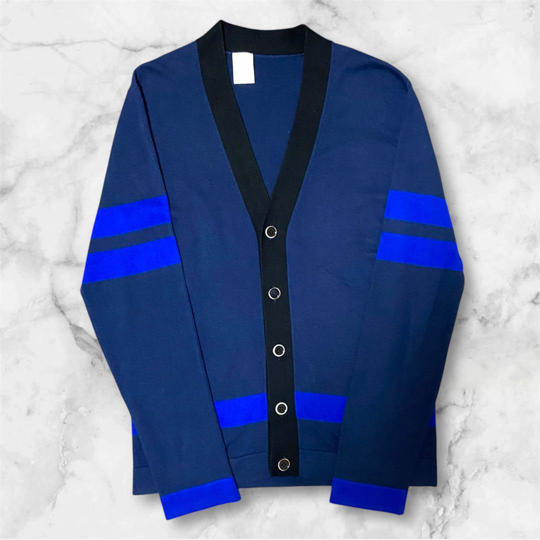 ネイビー生地にブルーのストライプデザインが特徴的なカーディガンです。コットンとアクリル素材でウールではないので日差しが気になるこの季節にピッタリです。