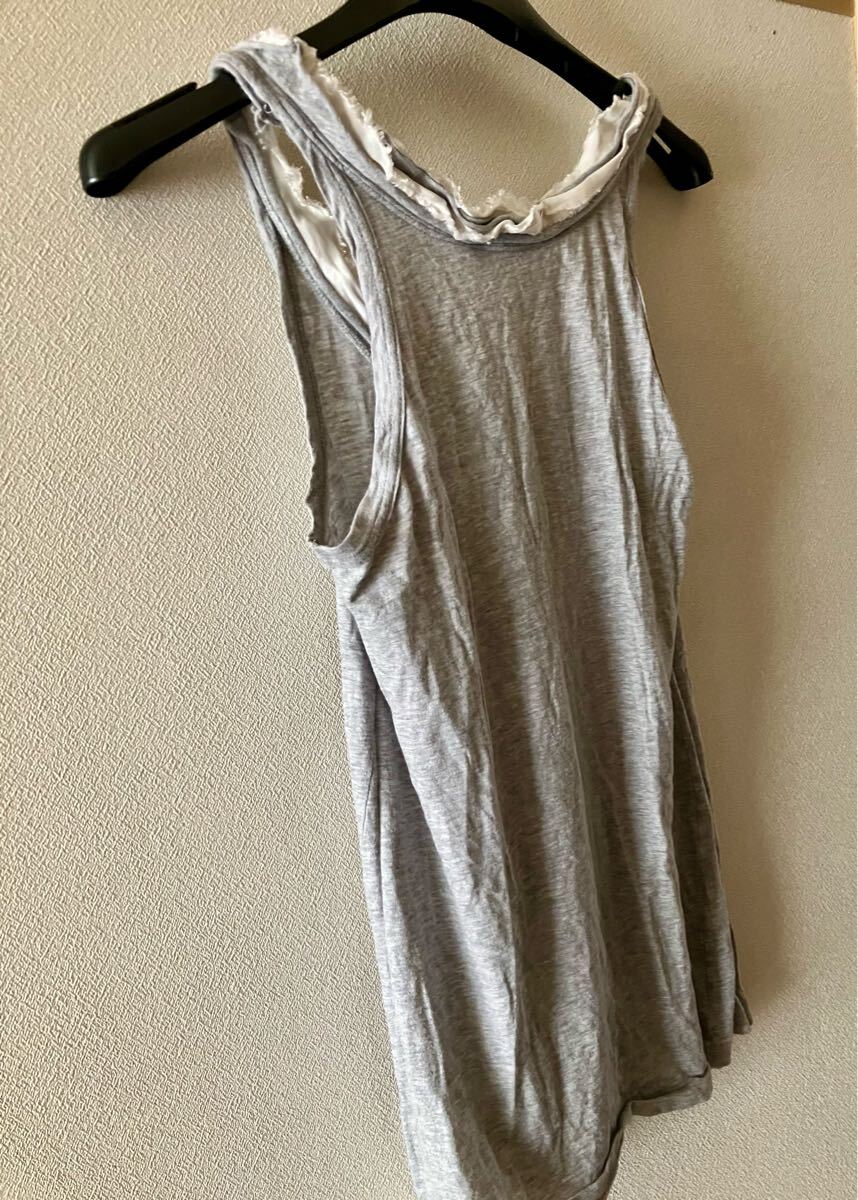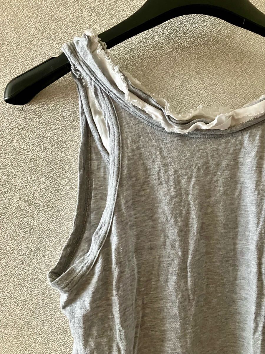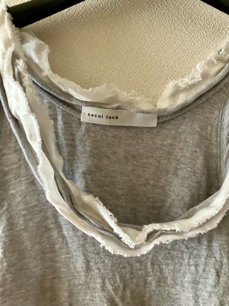 sacai luckのグレーのノースリーブTシャツ、フリルは切りっぱなしのデザインです。ネックラインがサカイらしいデザイン。
