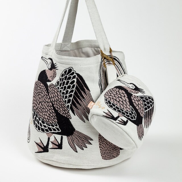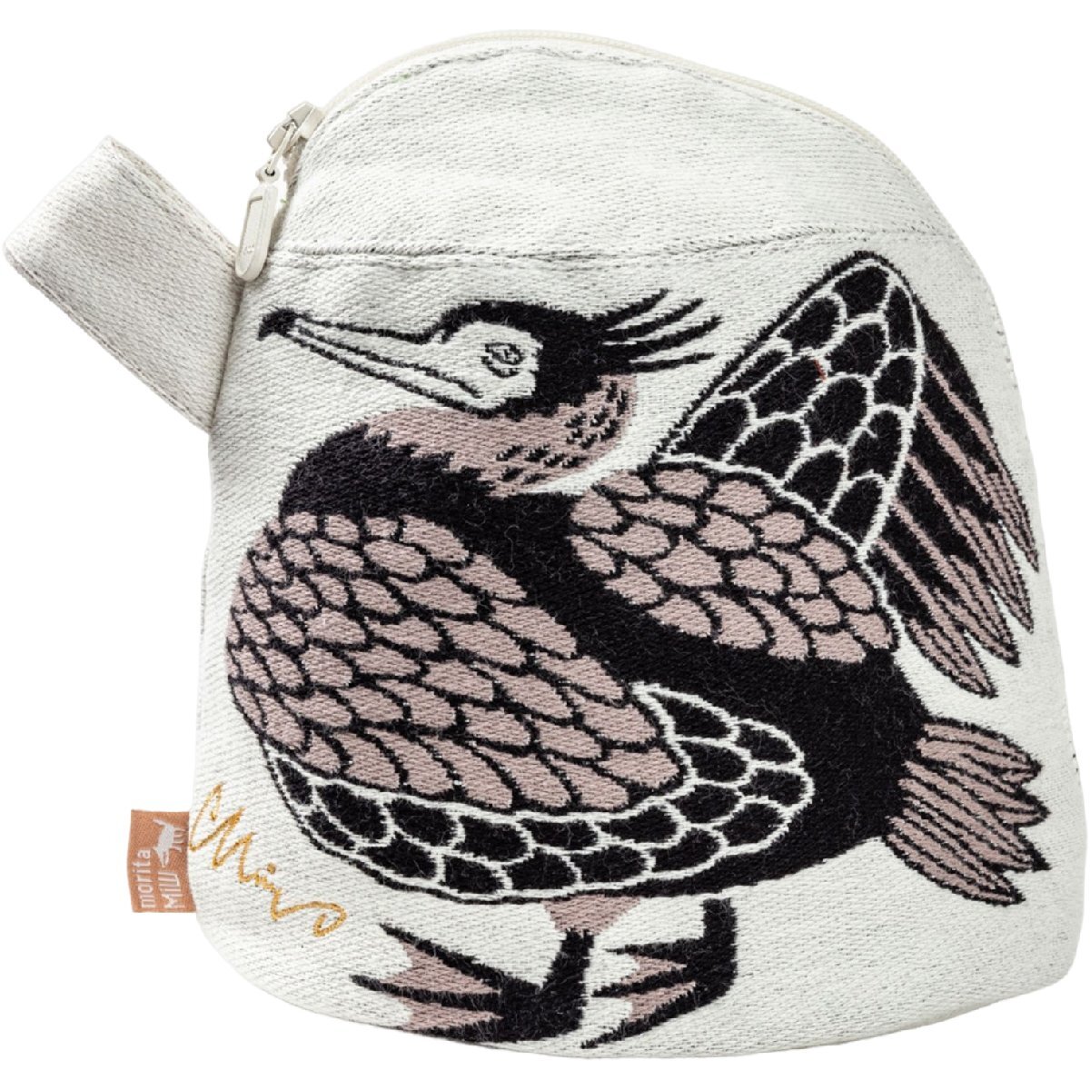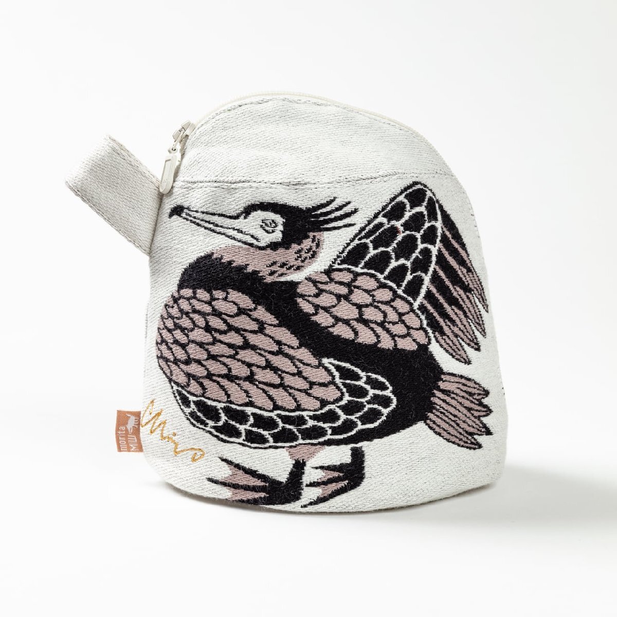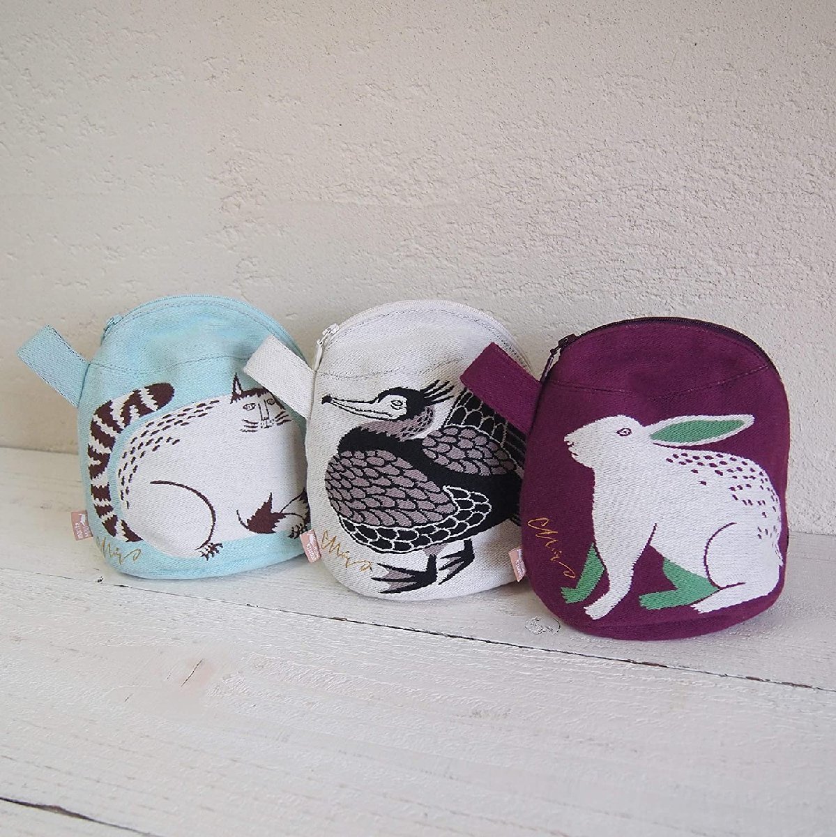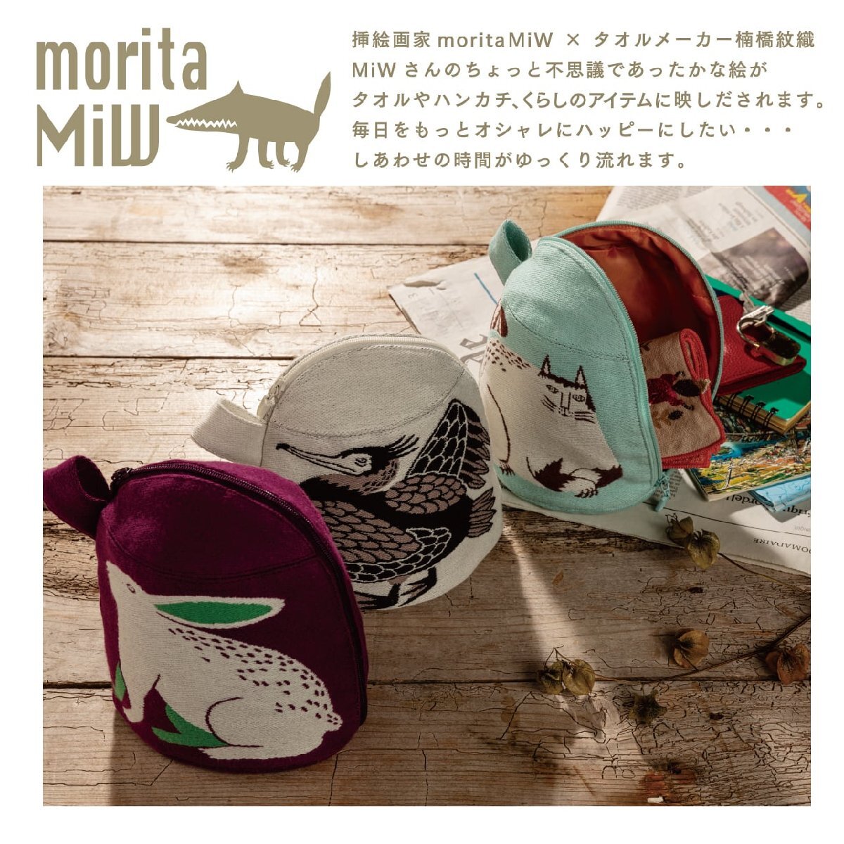 MiWさんの不思議な絵の世界を映しだすトートバッグと同じ柄のちっちゃくてコロリンとした愛おしいカタチのマチつきポーチです。