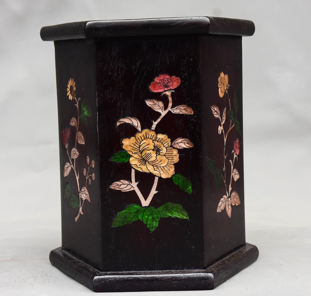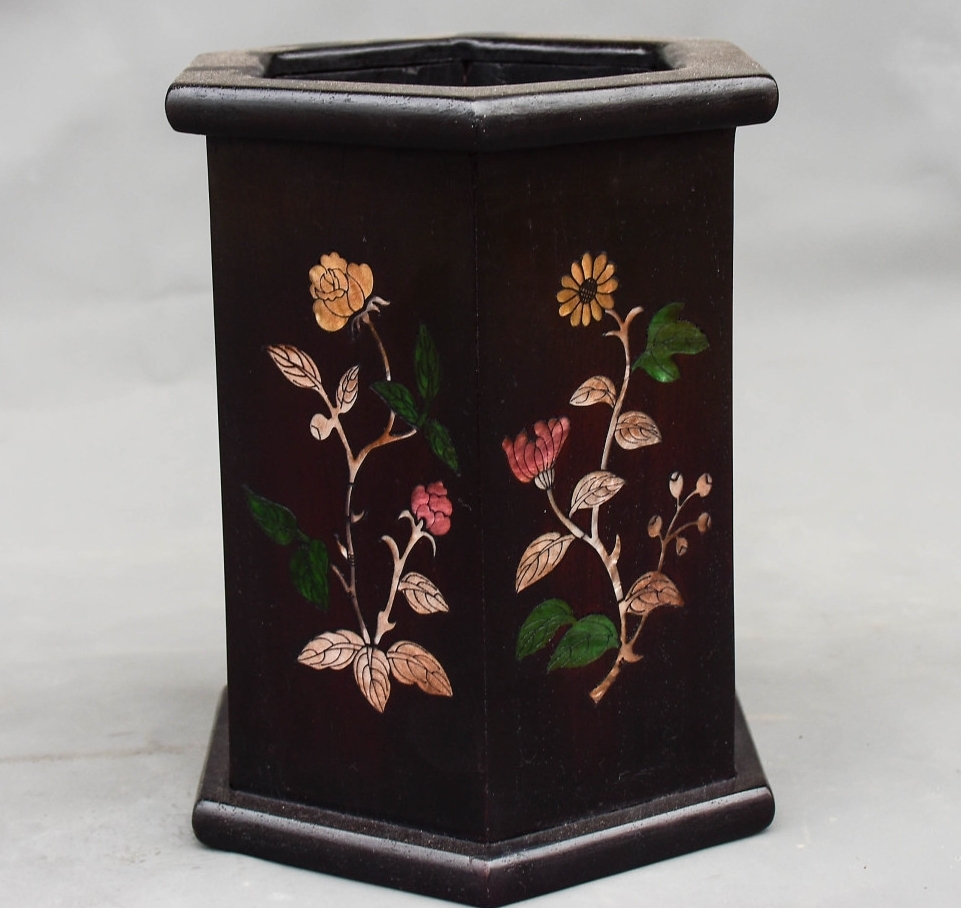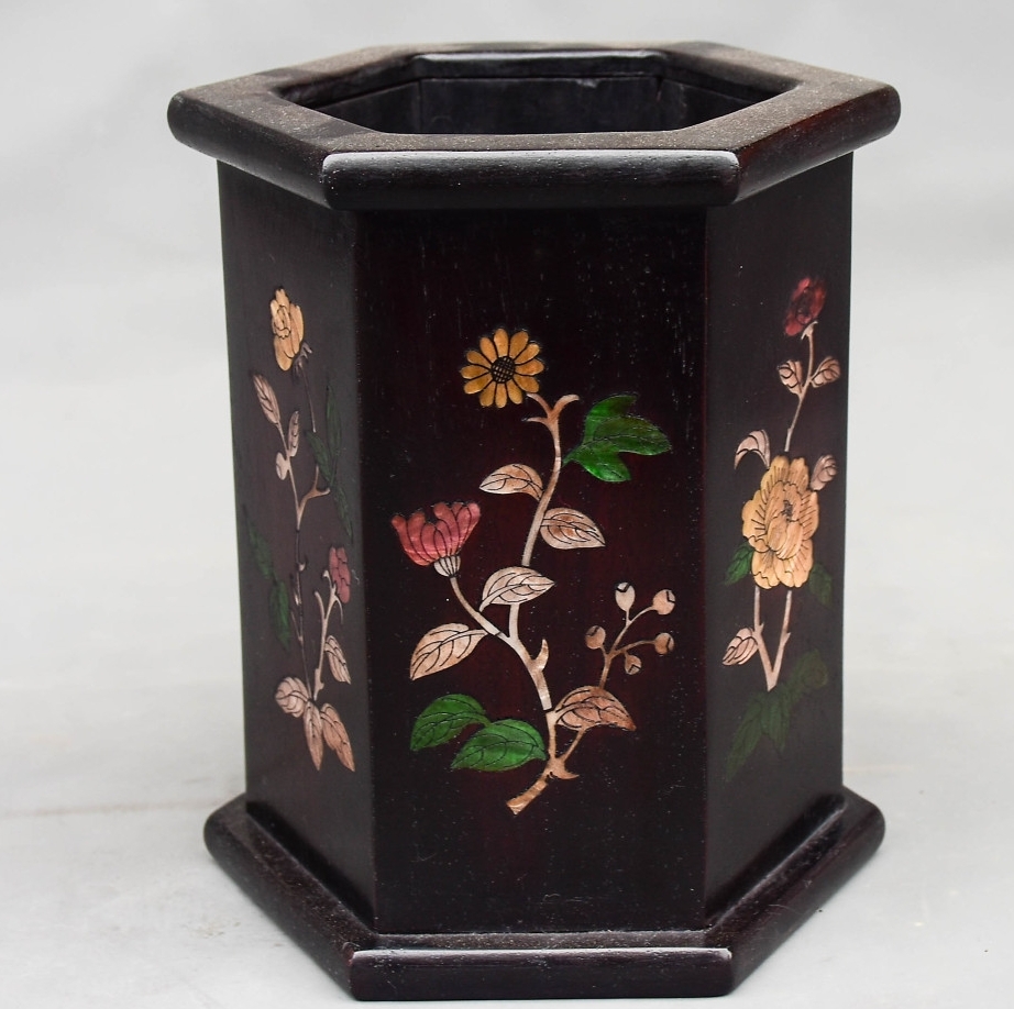 *珍品旧蔵* 清 黑檀木 はめ込む貝 六角筆筒 筆道具 文房具 置物 極細工 唐物 中国古玩 骨董品 古美味 H45