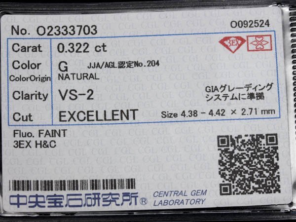 ●3EXCELLENT:ハート&キューピッド ●クラリティ:VS-2 ●カット:EXCELLENT ●カラー:G ●0.322ct 【ct数の刻印あり】 ◆付属品【中央宝石研究所】発行ソーティング】 |