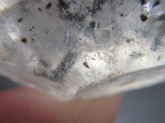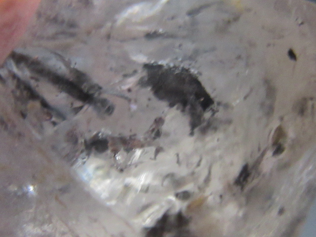 ・表面が凍ったような様子の素敵な水晶です。 いくつかの表層が欠損していますが、透明なその部分から内部の様子がよく観察出来ます。 内部には黒色鉱物の内包が見られます。