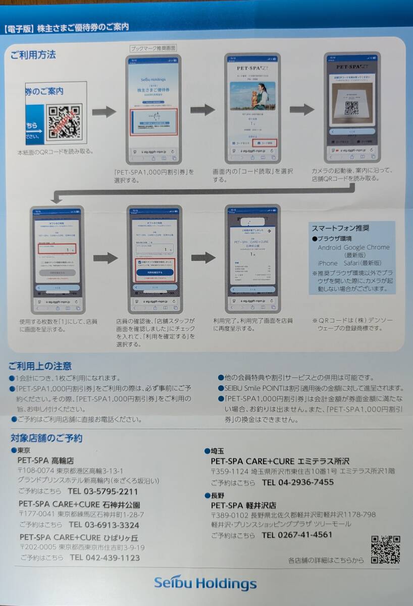 株主優待 西武ホールディングス PET-SPA 1000円割引券×3点です。