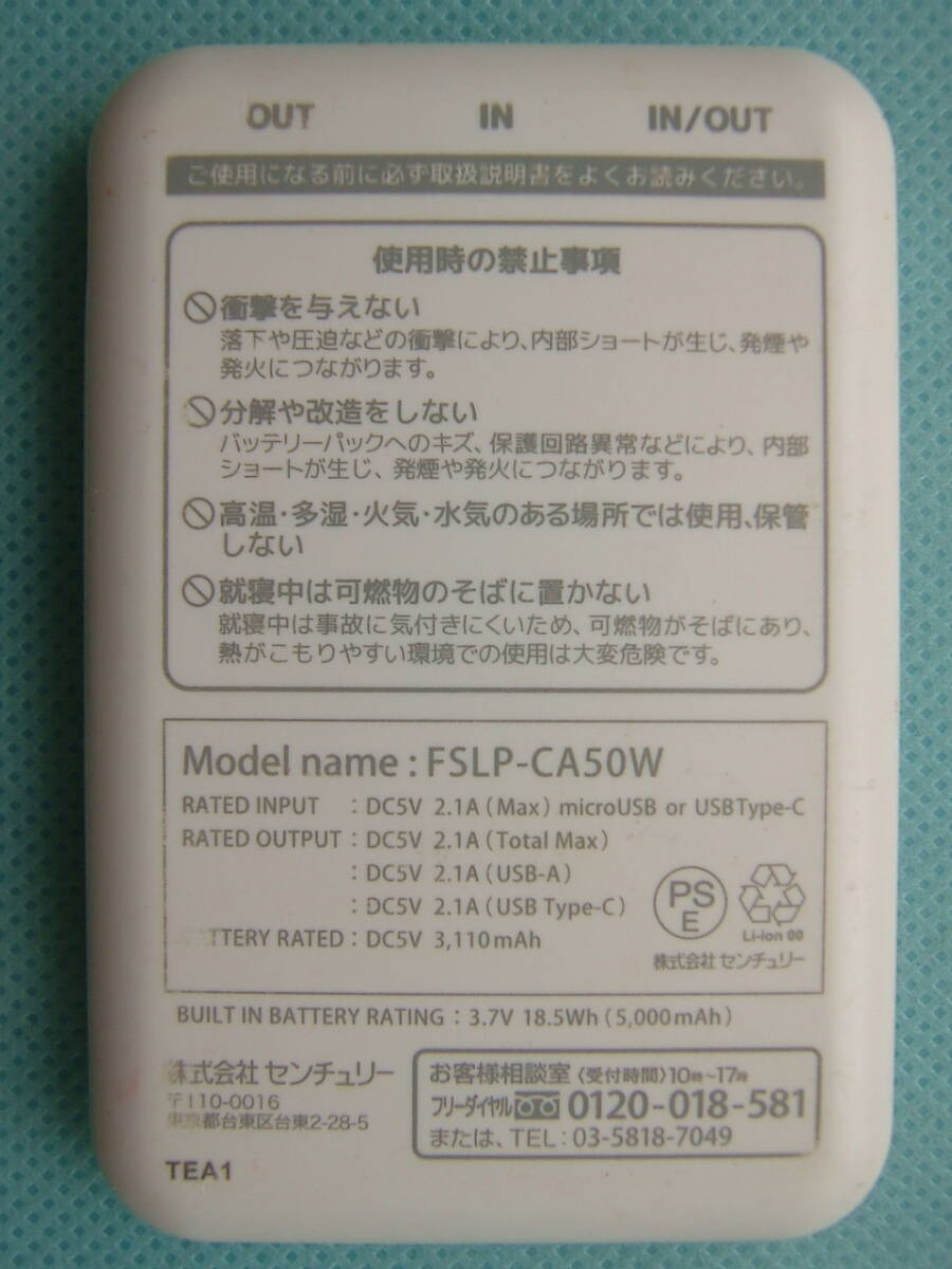 モバイルバッテリー 5,000mAh FSLP-CA50W センチュリー