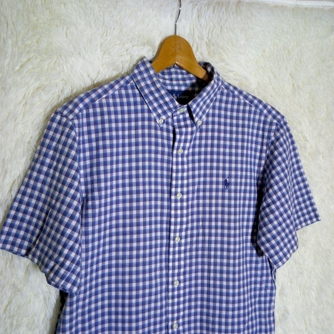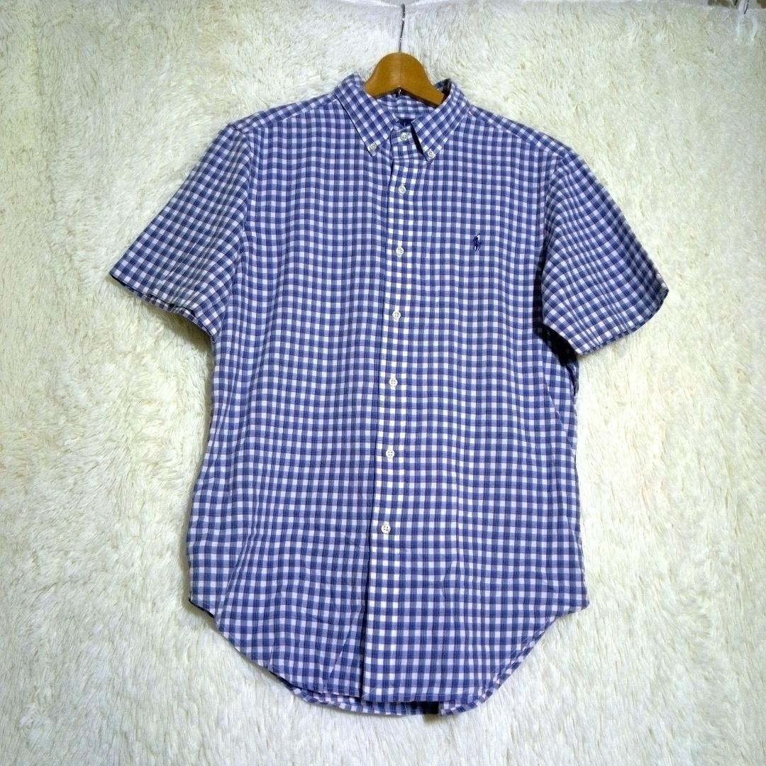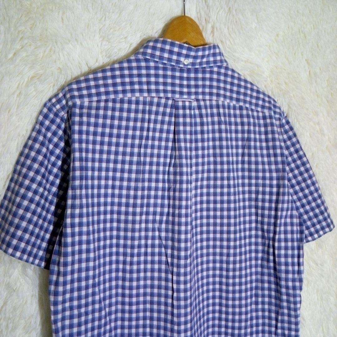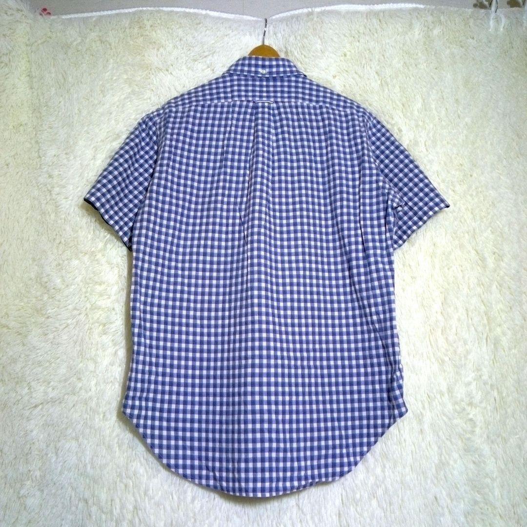 青と白のチェック柄の半袖シャツ、ボタンダウンカラーでカジュアルなスタイルに最適。