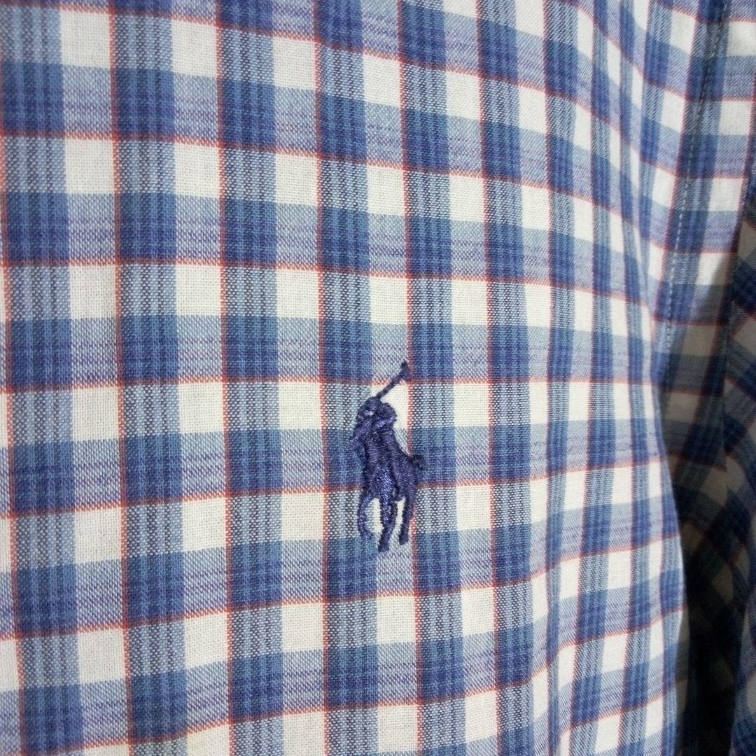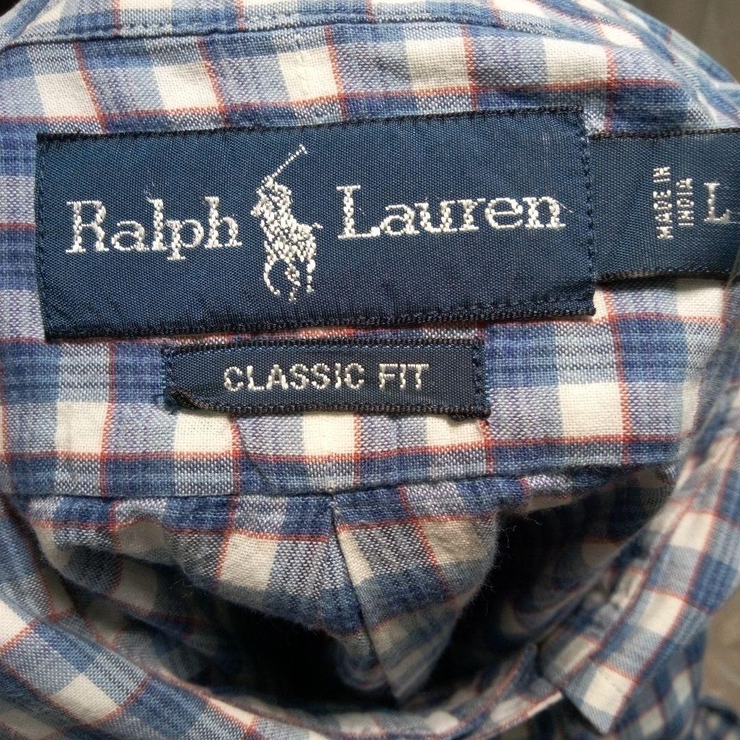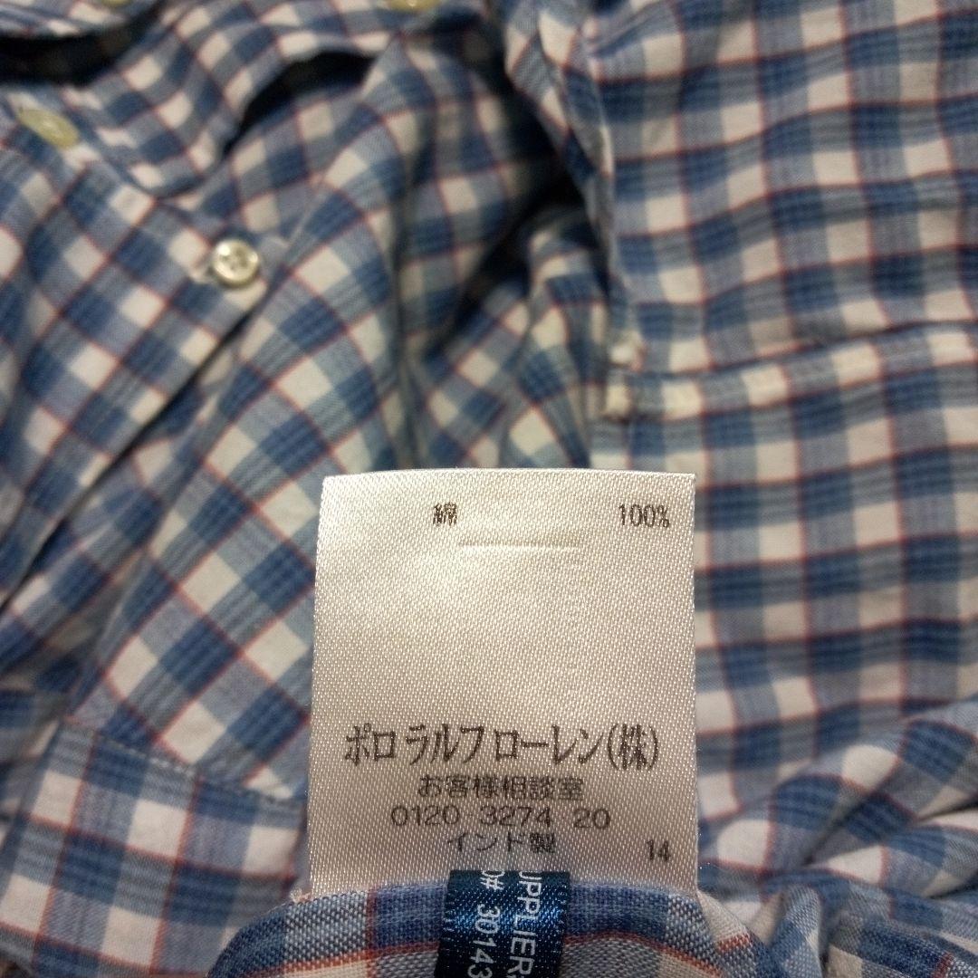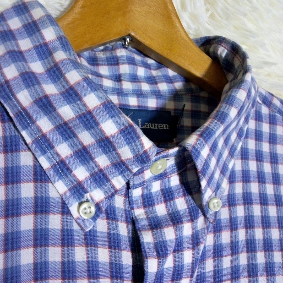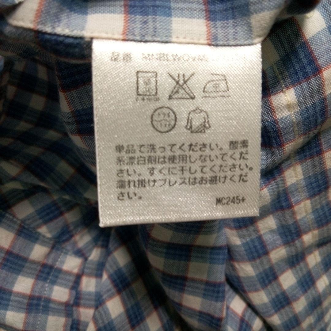 青と白のチェック柄の半袖シャツ、ボタンダウンカラーでカジュアルなスタイルに最適。