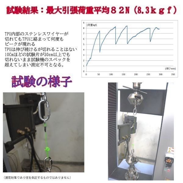 | コード色は ブラック 透明 グリーン レッド ブルー イエローの6色と各色1本づつ寄せ集めた6本セットをご用意しています。落札後に色指定してください。 【仕様】TPU+太さ0.3mm SUS304 ステンレスワイヤー入り 線径2.3mm 自由長30Cm 最大伸長1.5m 重量17g 引っ張り強度 8.3kg コード色は ブラック 透明 グリーン レッド ブルー イエローの6色と各色1本づつ寄せ集めた6本セットをご用意しています。カルビナが小さ目で目立たないので人目につく場所や街中などでも気にすることなく装着できます。 コードの内部はSUS304ステンレスワイヤー 防錆性高い18-8スレンレス鋼を採用コードの表面にはTPU被膜となっていて接触する物を傷つけません。 色々な工具を取り付けて落下防止をしたり置き忘れ防止の効果があります。又スマホに取り付けて置き忘れ防止することができ落下した時もスパイラル形状が衝撃を吸収するので破損のリスクが減らせます。 コードを2本3本と?げて使用する事により作業範囲を大きく取ることができて作業効率を低減させません。 海釣りや川釣りでも竿や道具を繋いでおくことにより誤って水の中に落とすことがありません。ハイキングやキャンプ、登山の時にでも落としそうな物カメラやコップ水筒、GPS機材なども落として紛失することがありません。 静岡県工業技術研究所 浜松工業支援センターで 強度試験を実施済引張強度8.3kgf(測定結果であり性能を保証するものではありません。) | |||