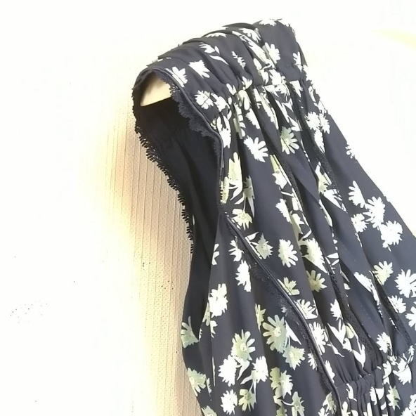 navy地に咲くグリーンの花が大人の遊びを感じさせる素敵なサマードレス、袖口レースがおしゃれ!