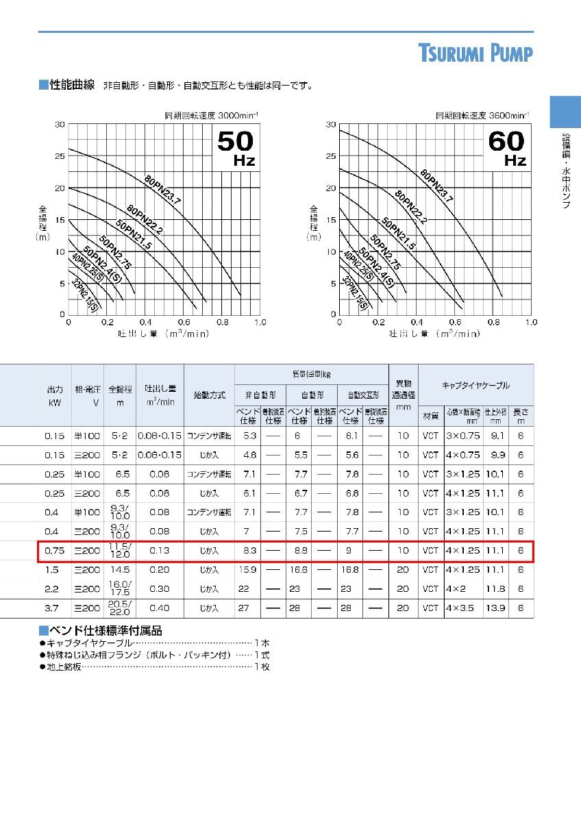 〈ツルミ〉50PN2.75 50Hz 東日本用 雑排水 水中ハイスピンポンプ PN型 非自動形 口径50mm 三相200V 出力0.75kW ツルミポンプ 代引不可