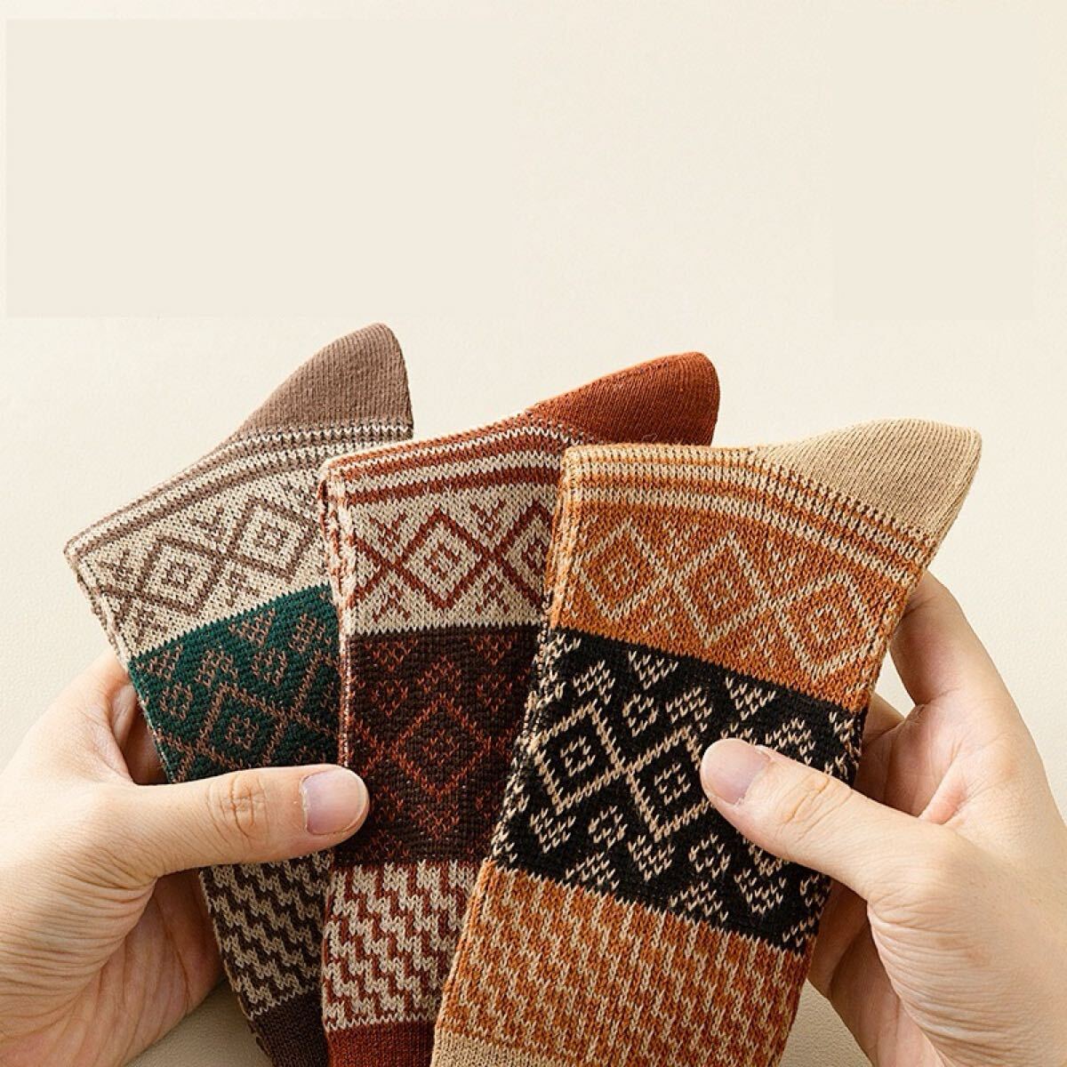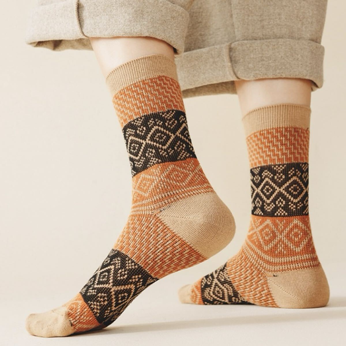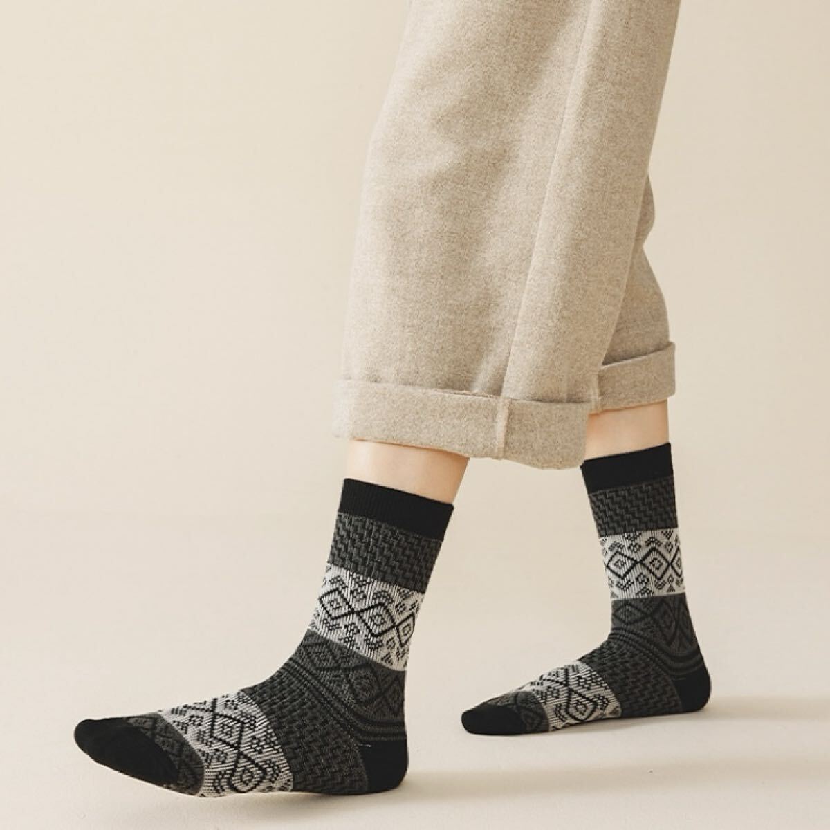 落ち着いた色味に幾何学模様が施されており、シンプルなコーディネートにアクセントを加えるカジュアルな靴下です。