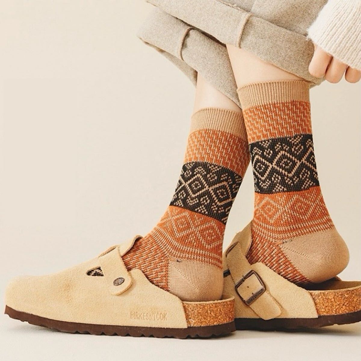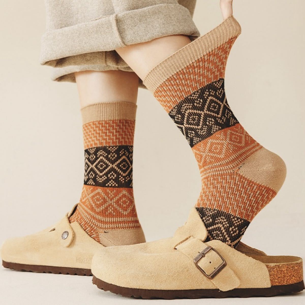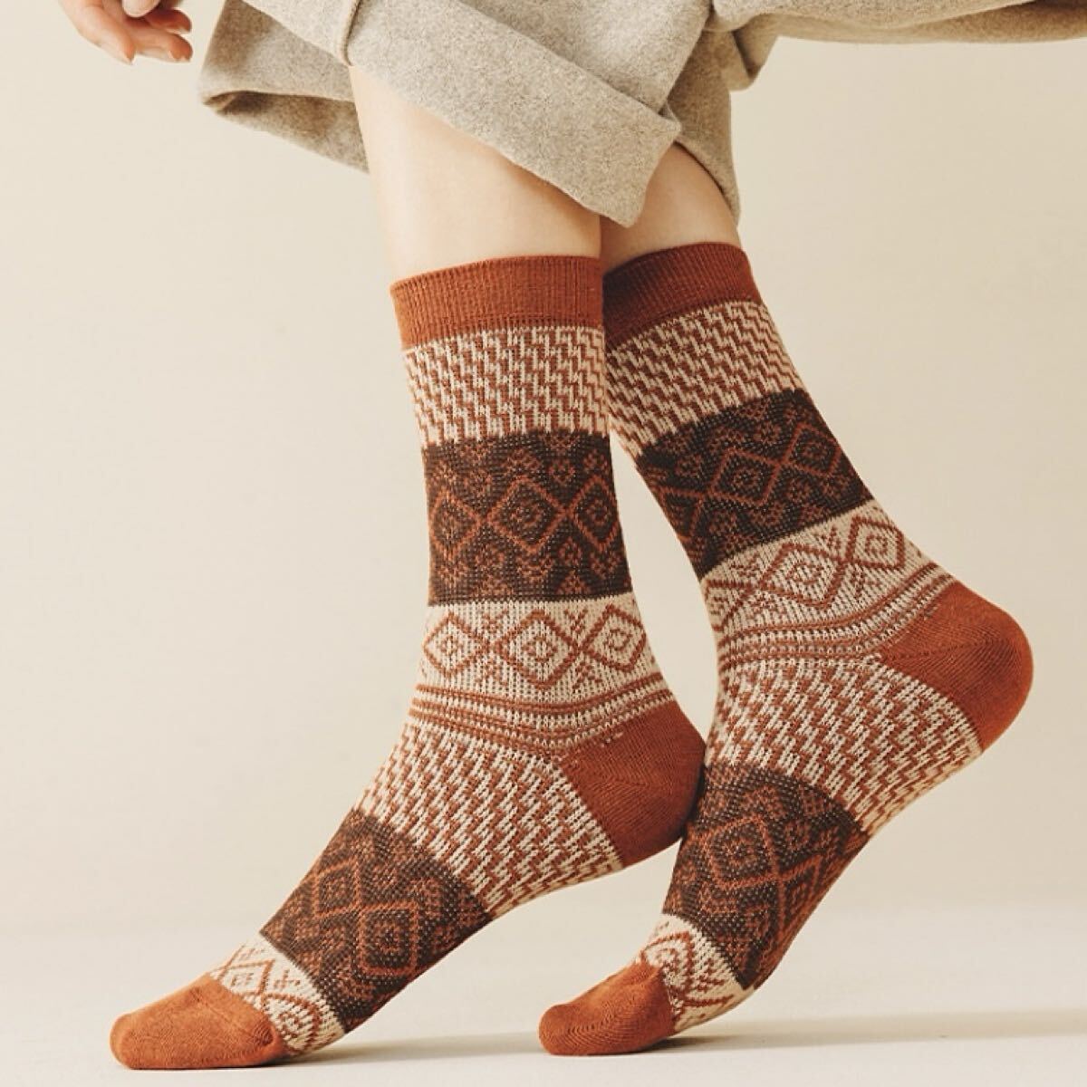 落ち着いた色味に幾何学模様が施されており、シンプルなコーディネートにアクセントを加えるカジュアルな靴下です。