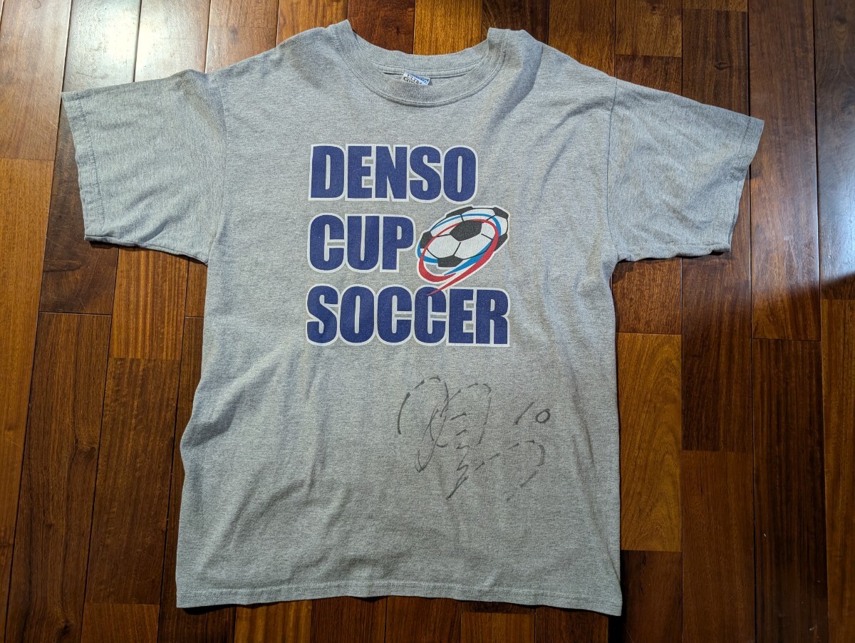 | 説明 | デンソーカップ選抜の大学選手に支給されたTシャツの出品です。 カラーは、グレーです。 サイズはLです。 福岡大学在籍時に選抜選出されました田代有三選手の直筆サインが、フロント部分に書かれています。大学卒業後、田代有三選手は、鹿島アントラーズに在籍され、日本代表としも活躍されました。 フロント、背中部分のプリントは、概ね良好です。 ポリエステル100%素材です。 |