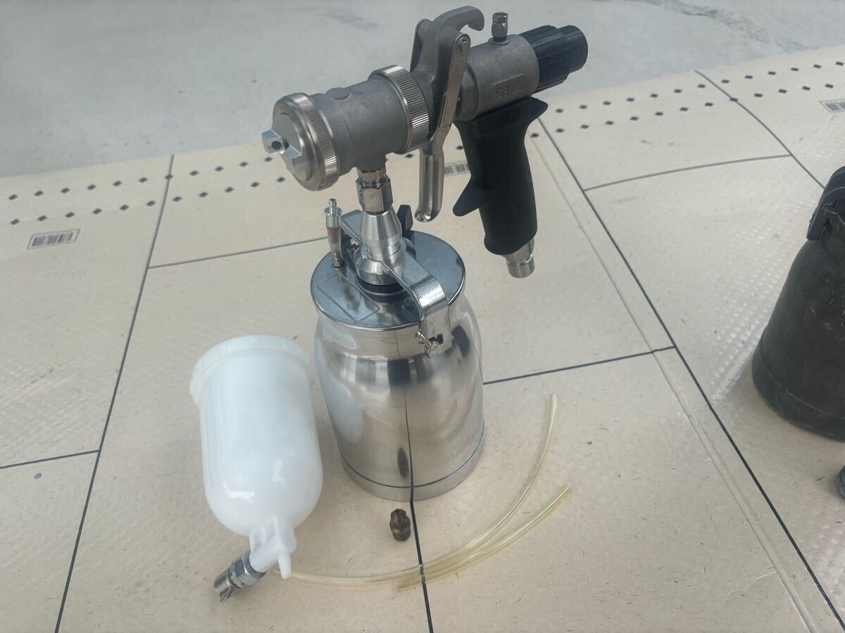 (写真5)中古ガン。細ニードル細ノズル取付た状態。高粘度太いノズルと太ノズルあり。ノズルは先が割れてますが吹付はできました。