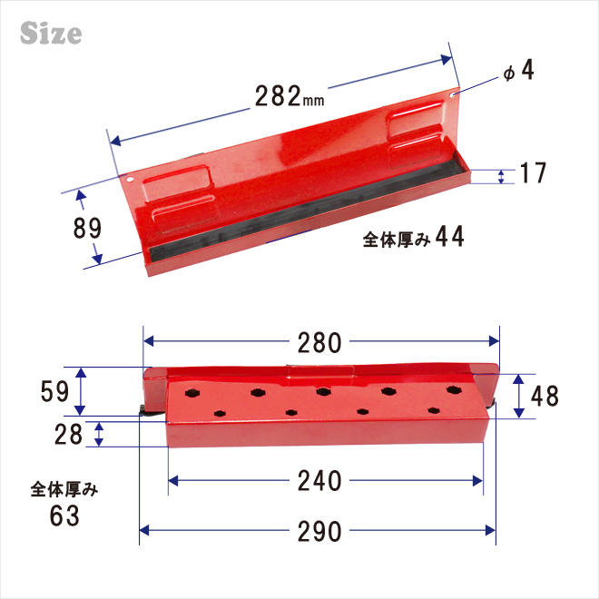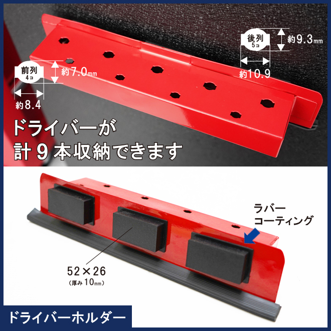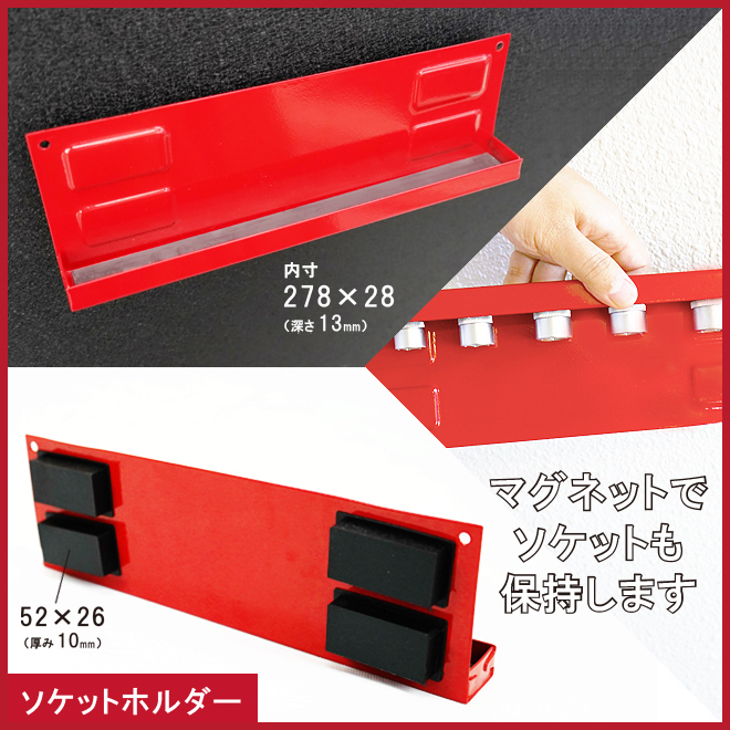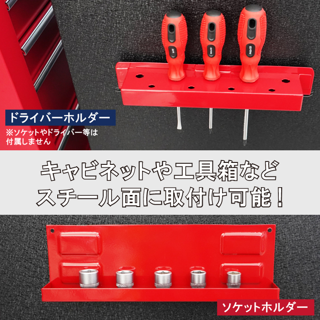 ●ソケットが収納できるソケットホルダーと、ドライバーを挿して収納できるドライバーホルダーのセットです ●マグネット仕様なので、キャビネットや工具箱などのスチール面に取付けできます ●強力マグネットはラバーコーティングされており、設置面の傷つけを防ぎます ●ソケットホルダーはソケットを置くだけで簡単に収納でき、マグネットでソケットの保持も可能です ●ドライバーホルダーは計9本のドライバーが収納できます ●自分の好きな所に収納場所を増やせて便利です ※ソケットやドライバーなどの小物は付属しません |