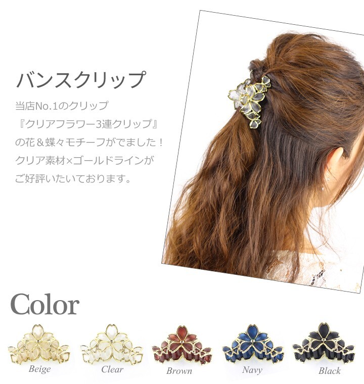 商品説明 | 人気のクリア素材×ゴールドふちどりヘアクリップ。 透明感あふれるモチーフで、アップスタイルを軽やかに作り上げます。 しっかりとしたバネでホールド力もバッチリ!! 軽め素材なので、髪の負担が少ないのも良いですね♪ |