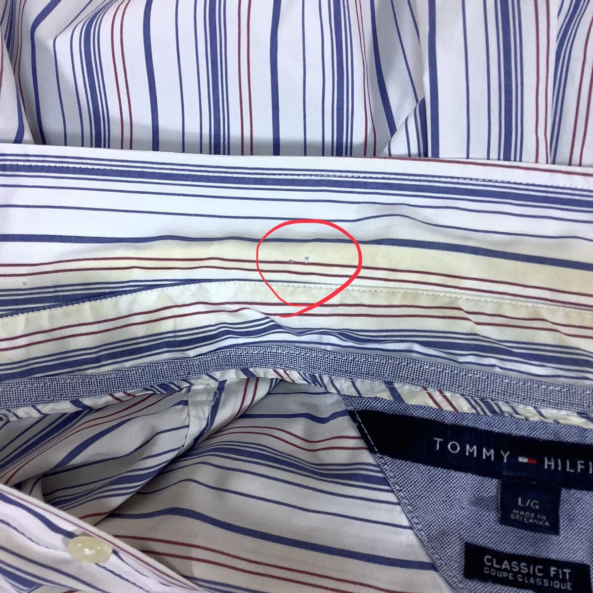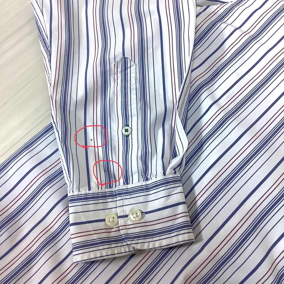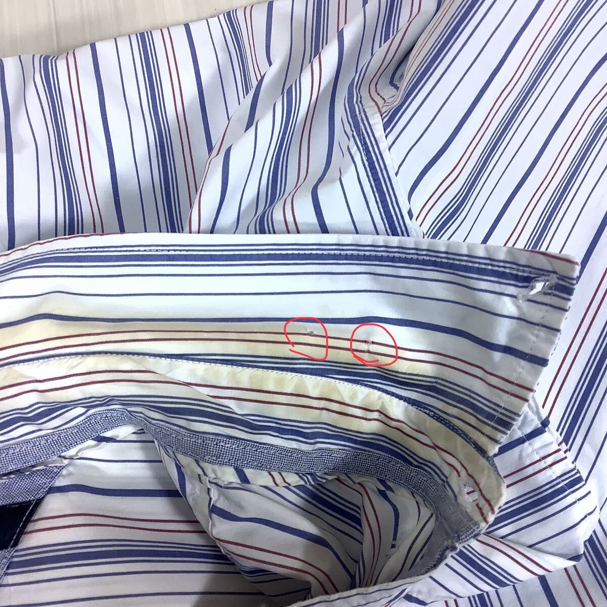 首まわりの黄ばみや引っ掻き傷、右袖に小さなシミなどが見られます。