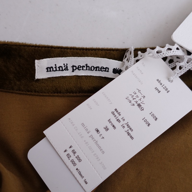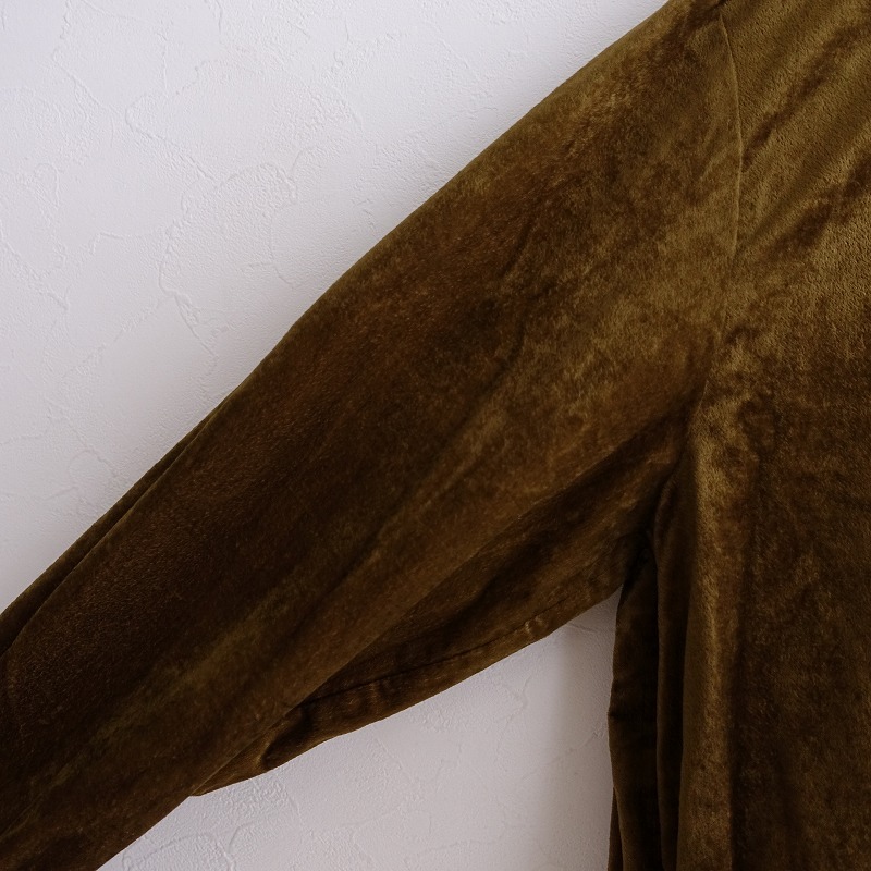 | mina perhonenのsyva ベルベットスタンドカラーブルゾンです。カラーはカーキブラウン(表記ブラウン)でベルベット地で仕立てられております。スタンドカラーデザインで、フロントはスナップボタン仕様、裾はゴム入りになっております。左胸に同色のチョウチョのワンポイント刺繍入り、定価(メーカー希望小売価格)68,200円 税込みの商品です。 |