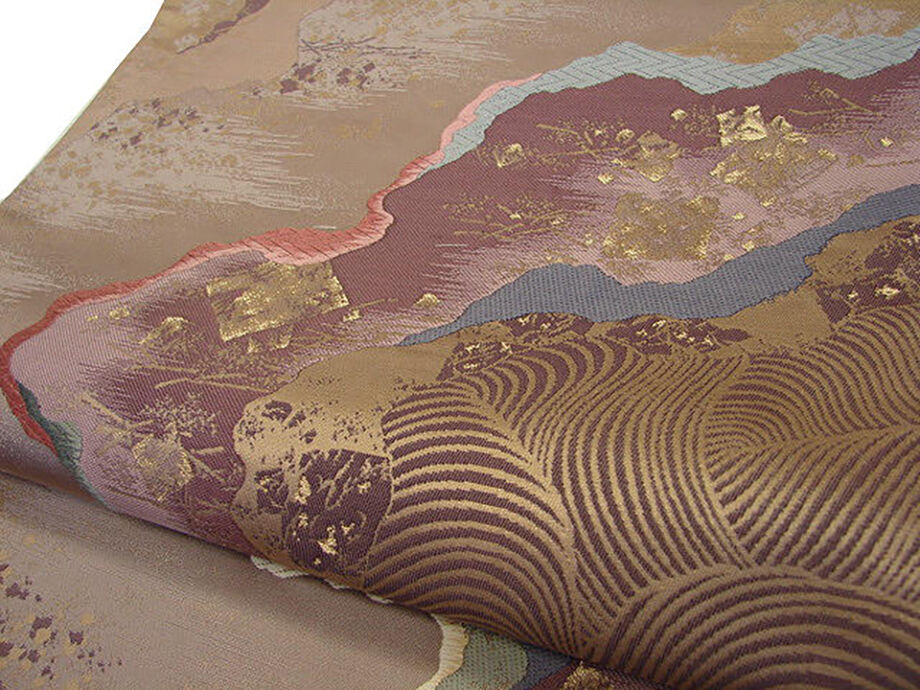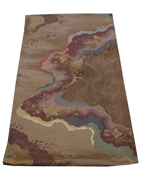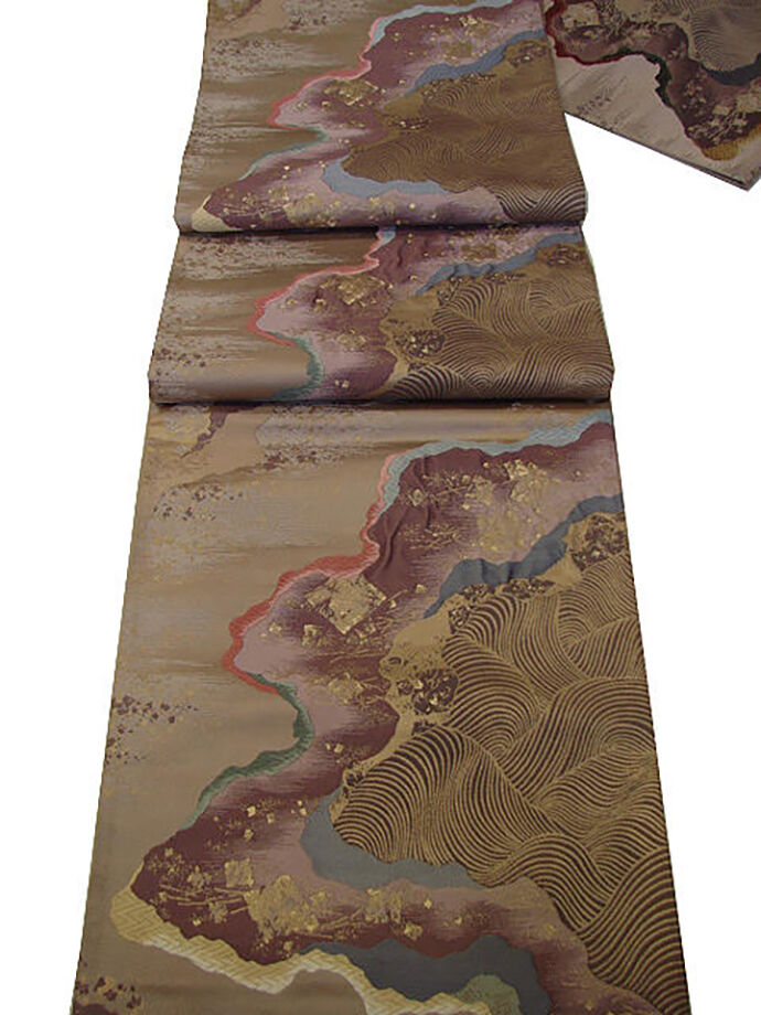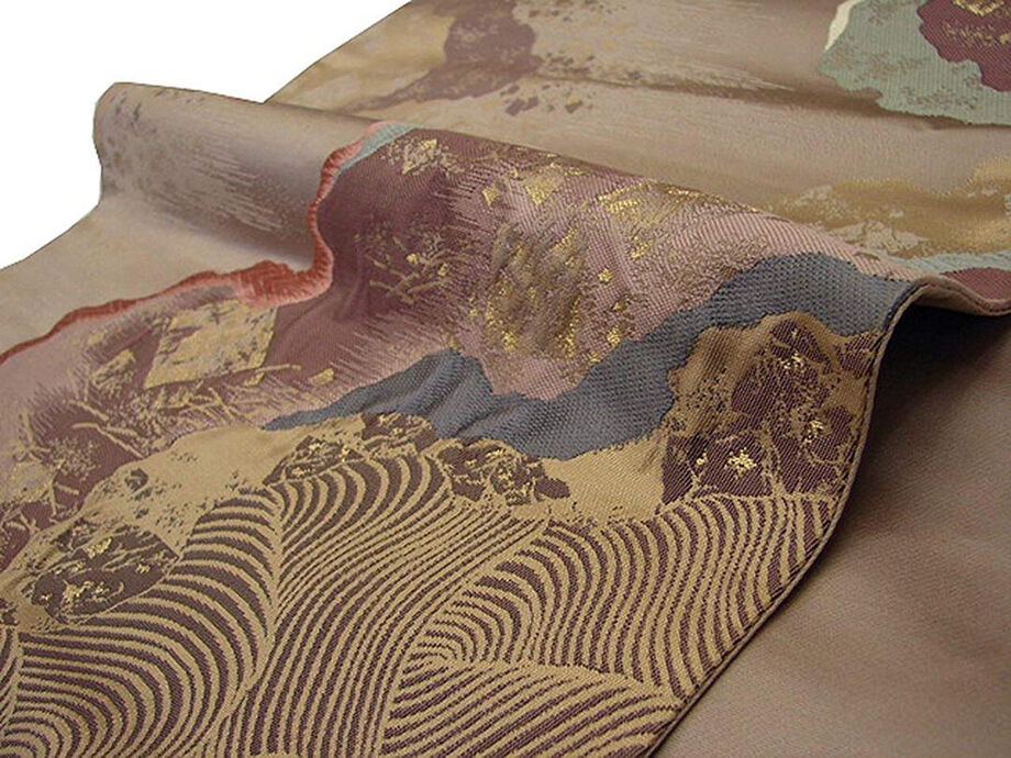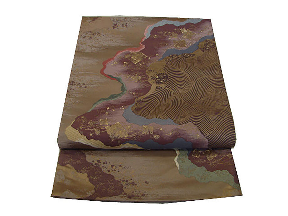 商品説明 | しなやかで滑らかな手触りの扱い易い袋帯。 茶鼠色地道長柄に波柄等の織柄。 六通柄。 |