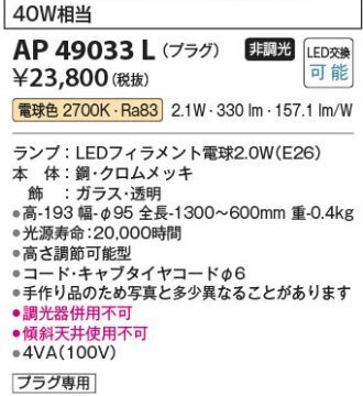 【品名】 Koizumi/コイズミ照明 ペンダントライト AP49033L 【コンディション】 新品未開封の商品になります。 現状のままのお渡しとなります。 【サイズ・仕様】 メーカー:Koizumi/コイズミ 品番:AP49033L 光源色:LEDフィラメント電球2.0W 色温度:2700K 電圧:100V 光源寿命:20000時間 40W相当 付属品・パーツなどは写真にある物が全てです。 |