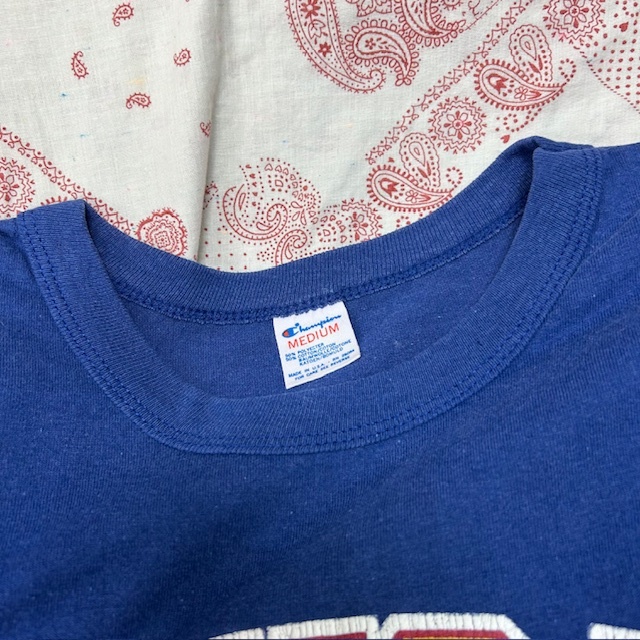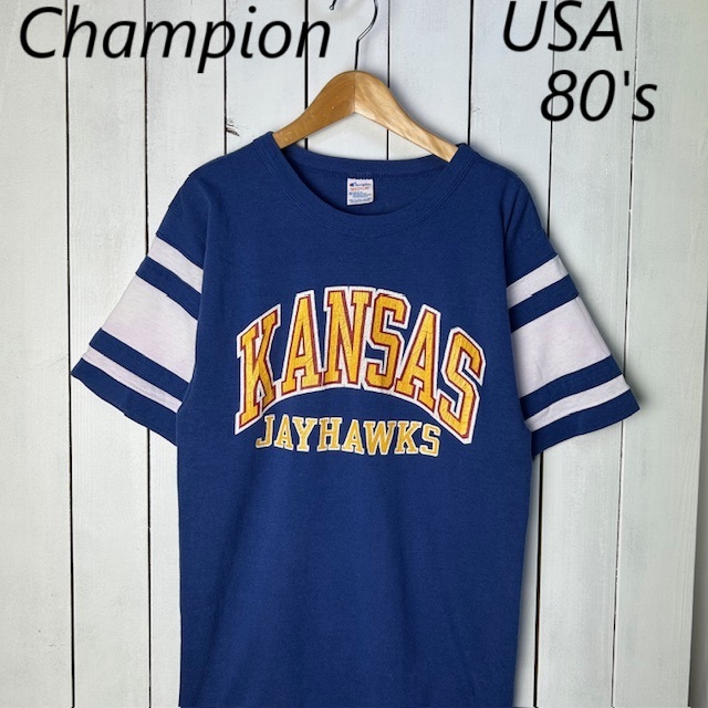 T●407 USA古着 80s USA製 トリコタグ チャンピオン 切替えカレッジTシャツ M 青 オールド ヴィンテージ シングルステッチ カンザス ジェイホークス