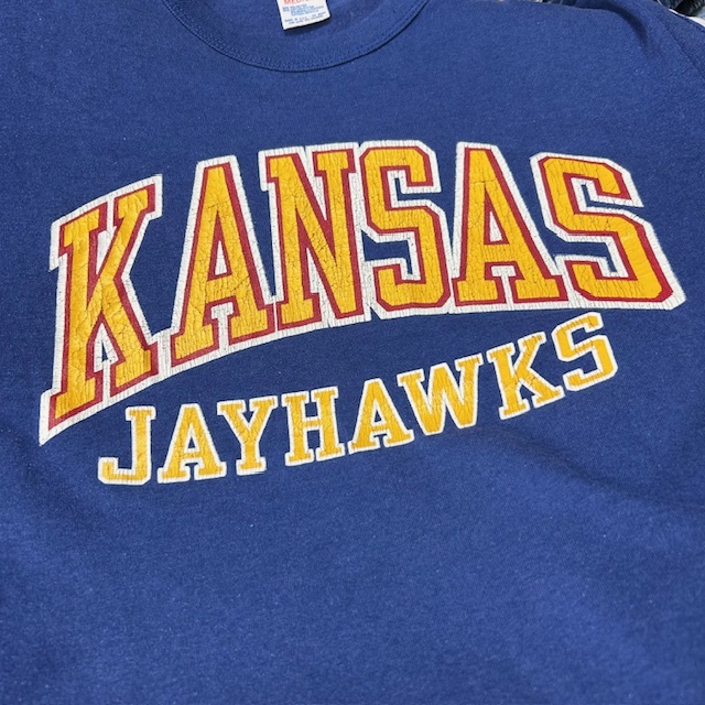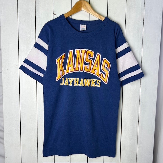 T●407 USA古着 80s USA製 トリコタグ チャンピオン 切替えカレッジTシャツ M 青 ヴィンテージ シングルステッチ カンザス ジェイホークス