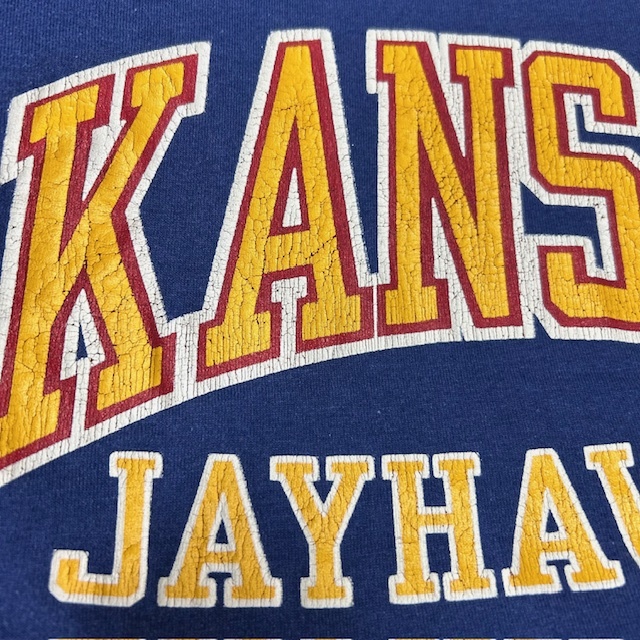 ●商品説明・・・アメリカ古着になります。80年代(トリコタグ)のオールド・ヴィンテージのチャンピオンの袖部分がライン入りの切替えになったカレッジTシャツです。カンザス大学のKANSAS JAYHAWKS物になります。細かくクラックの入ったプリントがヴィンテージUSEDのとてもいい風合いです。made in USA (アメリカ製)で、素材はコットンとポリの50/50です。袖・裾共にはシングルステッチです。USA M表記ですが、オールド物のやや小さめなシルエットで、身幅的に今のS程度のサイズ感かと思います。