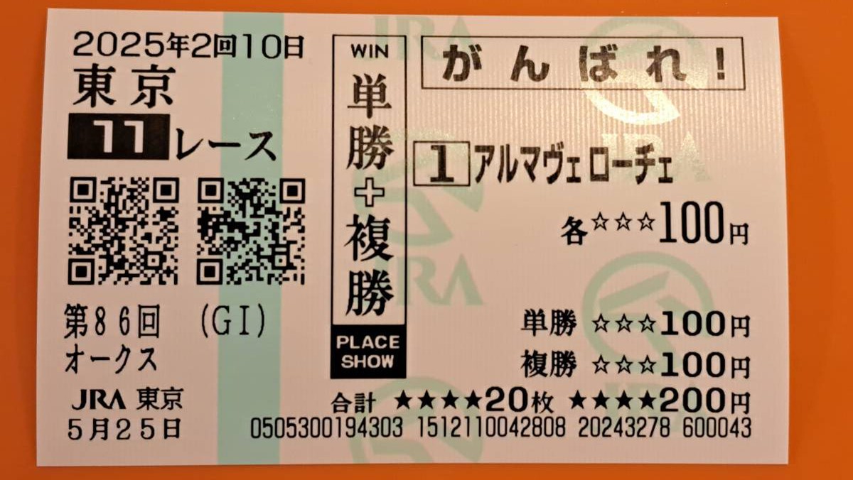 こちらの商品は、2025年5月25日に行われた東京11R・第86回優駿牝馬に出走したアルマヴェローチェの現地単勝・複勝馬券です。
