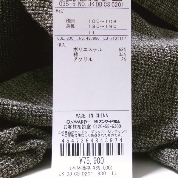 ◆DAKS(ダックス) ニットジャケット新品です。 サイドベント、裏地なし。 素材的に一見分かりにくいですが右袖先から23cm上に糸引きがあります。画像参照して下さい。 品質タグにカットがあります。ご理解の上、ご入札をお願いいたします。 定価¥75.900 表記サイズ LL 実寸サイズ 肩幅:48cm 身幅:55cm 着丈:75cm 袖丈:63cm ※すべて平置きにして採寸しております。 採寸は参考程度とさせていただきます。 カラー ベージュ系(画像参照して下さい) 素材 ポリエステル63% 綿35% アクリル2% |