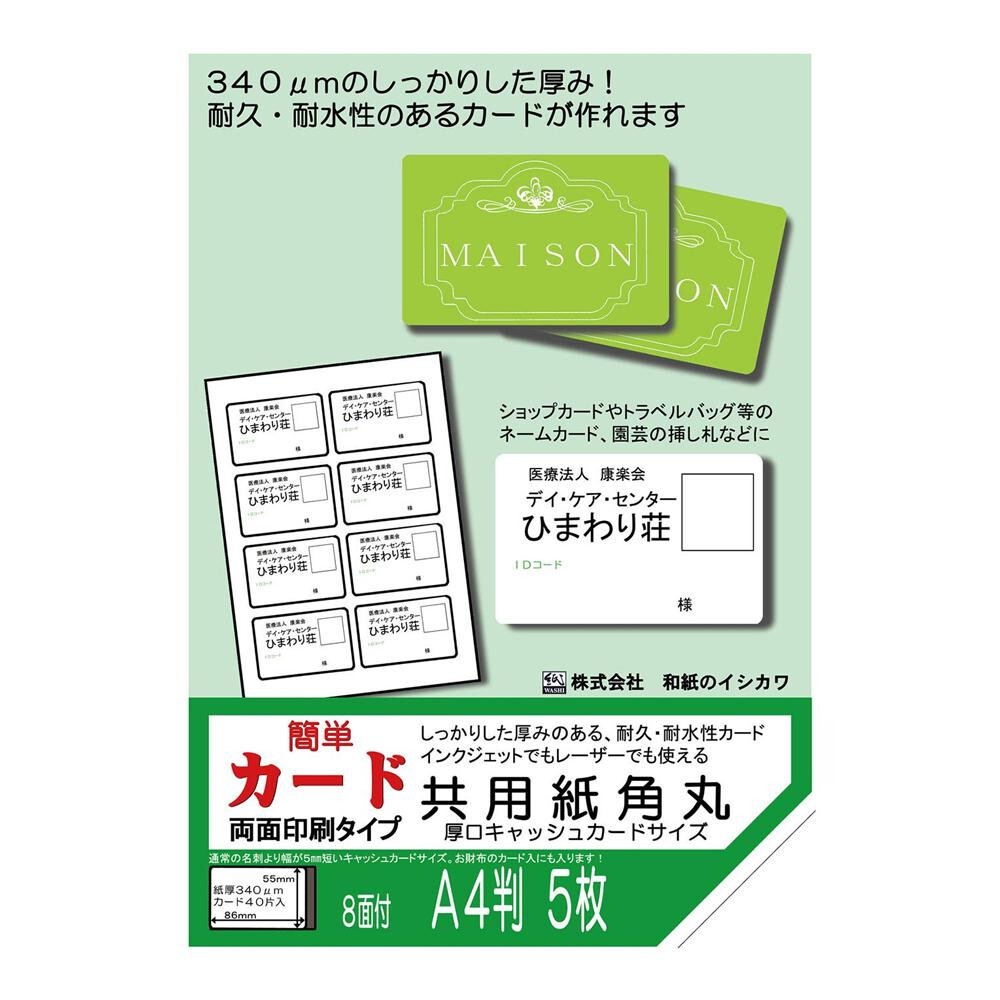 | 裏表ともに全面印刷出来ます。財布のカード入にも入るキャッシュカードサイズ(86×55ミリ)。インクジェットプリント・レーザープリント共用タイプです。紙のコシが強いため印刷時に用紙が曲がるタイプのプリンターには適していませんのでご注意ください。プリント後、カットに沿って軽くちぎるだけで四辺がきれいなカードが簡単に作れます。8面×5枚で40枚のカードが作れます。 |