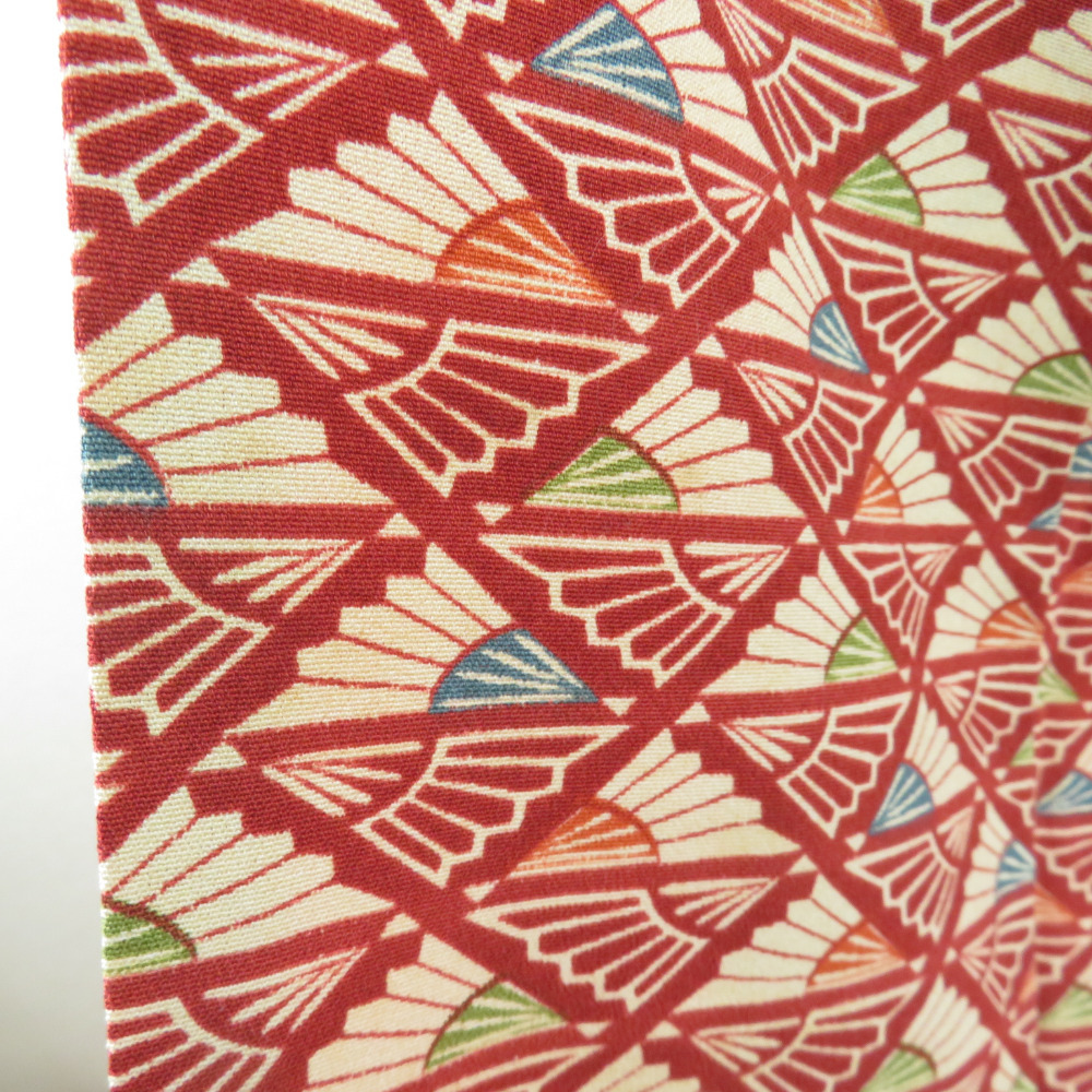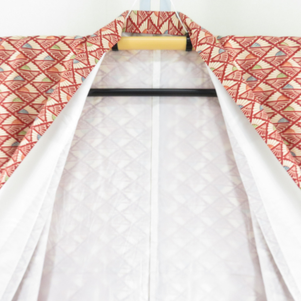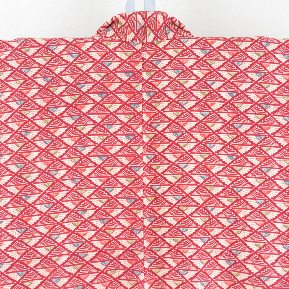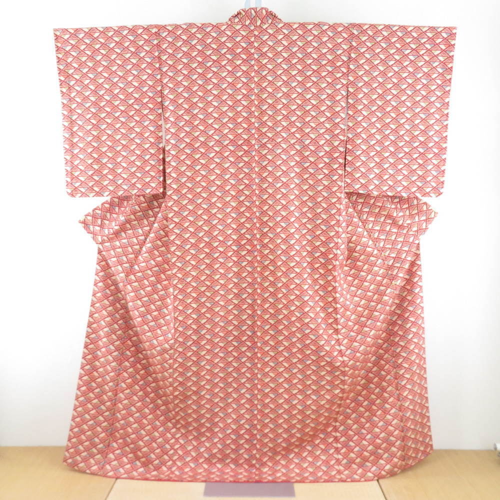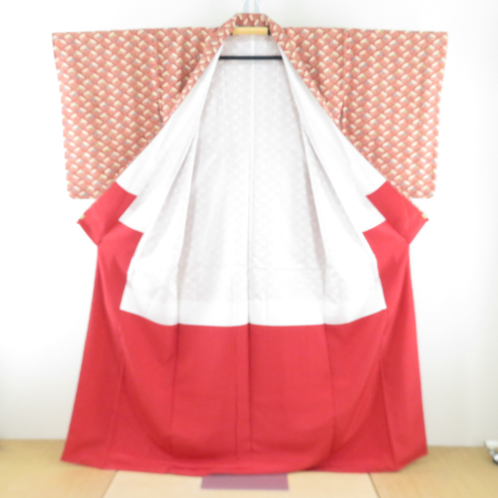 | 小紋 向かい扇模様 朱色x多色 正絹 広衿 仕立て上がり着物 身丈163.5cm |