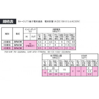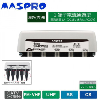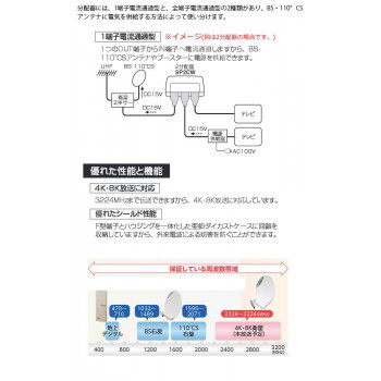 4K・8K衛星放送(3224MHz)に対応、地デジ・BS・CS分配器(1端子電流通過型4分配器)です。 |