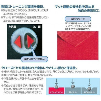 弾力と保温性、マット運動の安全性を高める独自の表面加工。細かい気泡(セル)を無数に含んだ構造なので、薄くても弾力があり、ショックをやわらげます。軽くて持ち運びやすく、耐久性があるので長く丈夫に使えます。体温を保持し、床面の冷たさを伝えません。軽い、滑らない、衛生的、断熱効果が高いなど、マットに求められる条件をクリアしたトレーニングマットです!! ※エアレックスマットは、運動靴の使用で破損することがあります。 ※商品サイズは、製造工程上、±5%の誤差が生じる場合があります。 ※厚さ寸法は製造工程上、±25%の誤差が生じる場合があります。 |