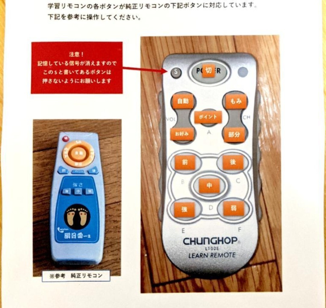 栄進金属工業の明日香2足つぼマッサージ機の純正リモコン信号を記憶させた学習リモコンです。