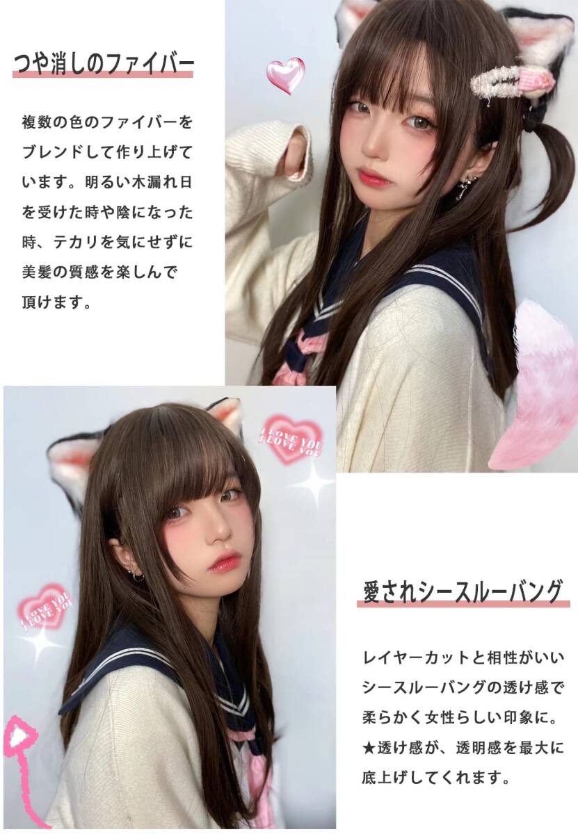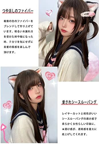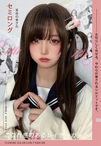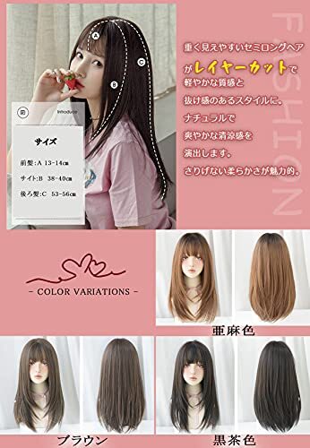 商品説明 | 重く見えやすいストレートヘアがレイヤーカットで軽やかな質感と抜け感のあるスタイルに。ナチュラルで爽やかな清涼感を演出します。 サイズ:?前髪:約15cm、?後髪:約57cm。カラー:ブラウン、亜麻色、黒茶色。セット内容:ウィッグ、ウィッグネット、櫛、取扱説明書。 ファイバーウィッグの難点だったテカリを軽減した複数の色のファイバーをブレンドして作り上げていますので、テカリを気にせずに美髪の質感を楽しんで頂けます。 人のつむじに近いIの字型になっており、ナチュラルで自然、かわいいスタイルを楽しむことができます。 伸縮性のある柔らかいウィッグキャップを採用し、更に快適なつけ心地です。アジャスターで簡単にサイズ調節可能。