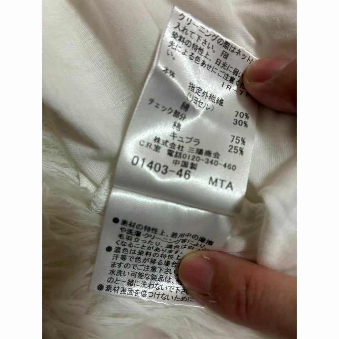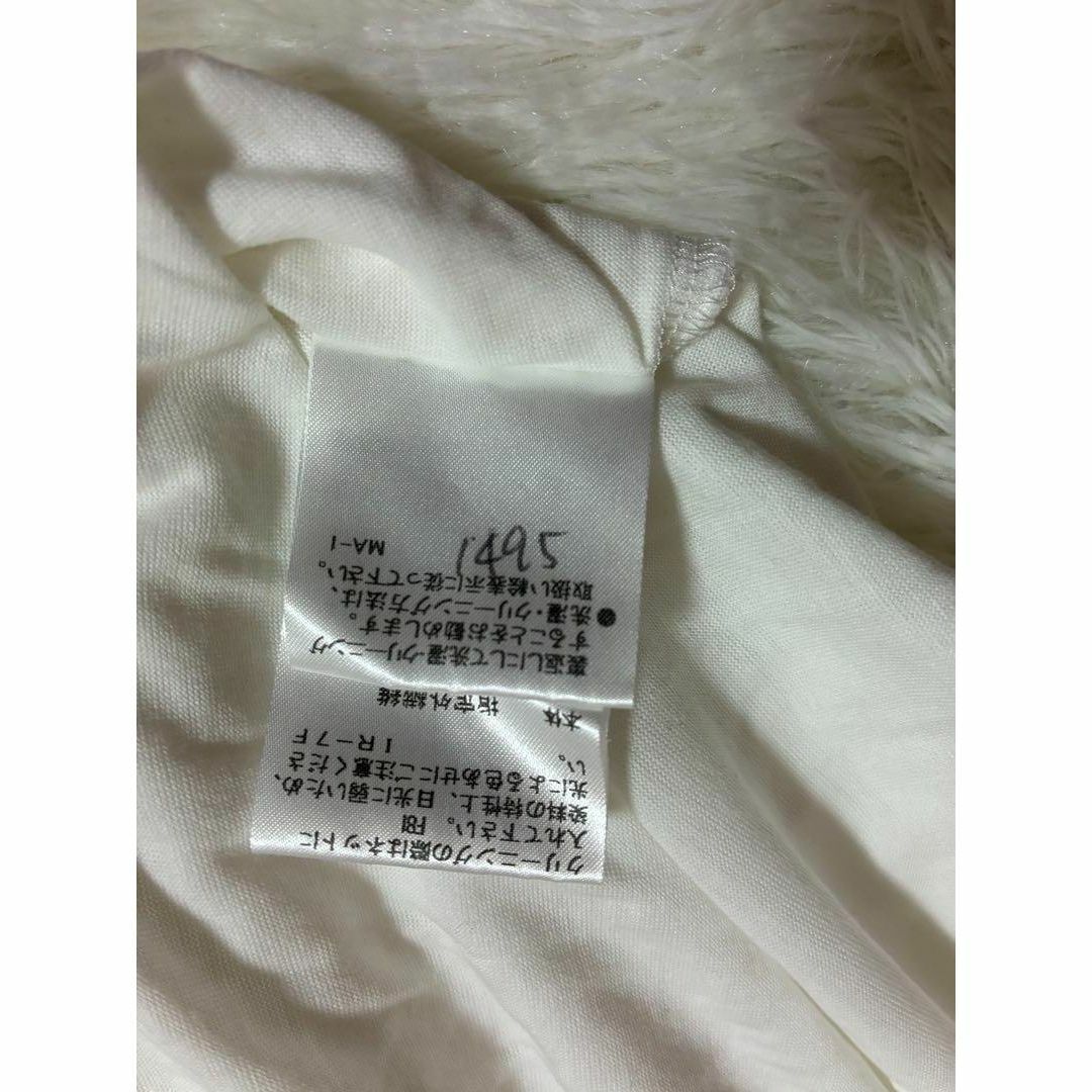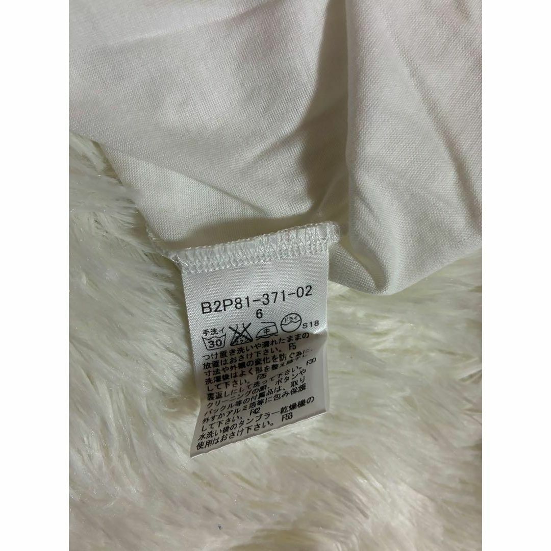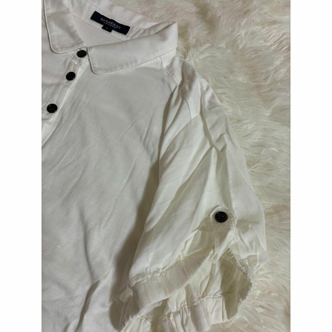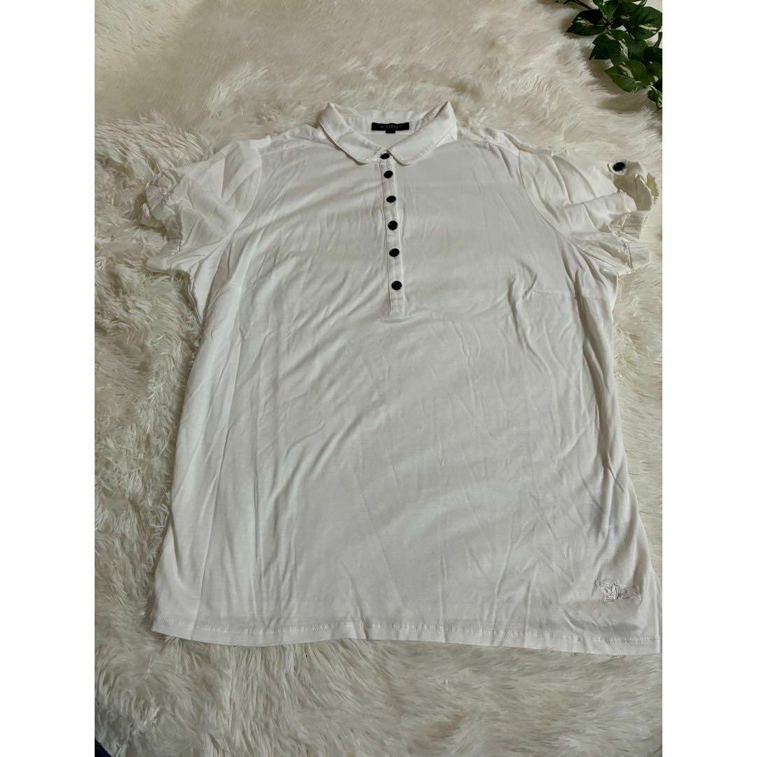 ホワイトのポロシャツスタイルで、黒色のボタンと袖のデザインが特徴的です