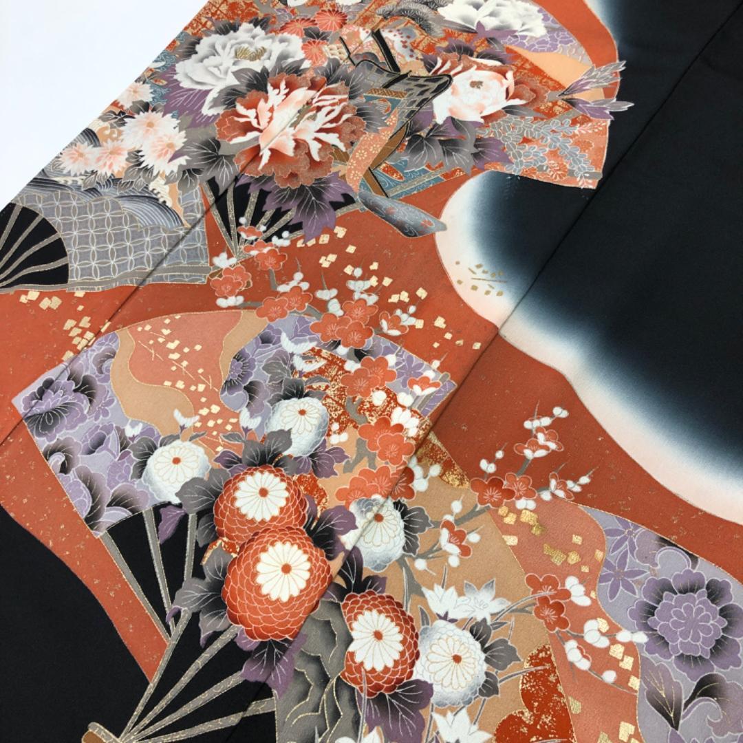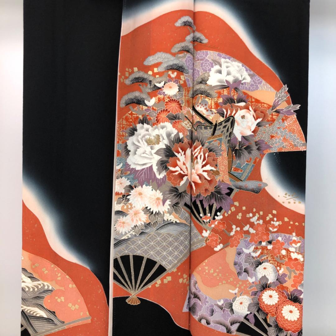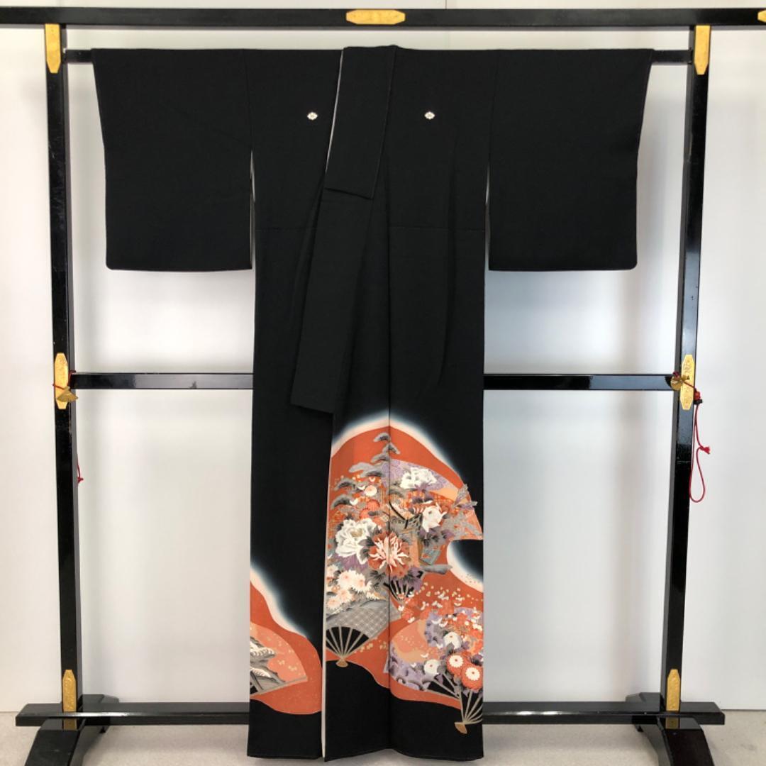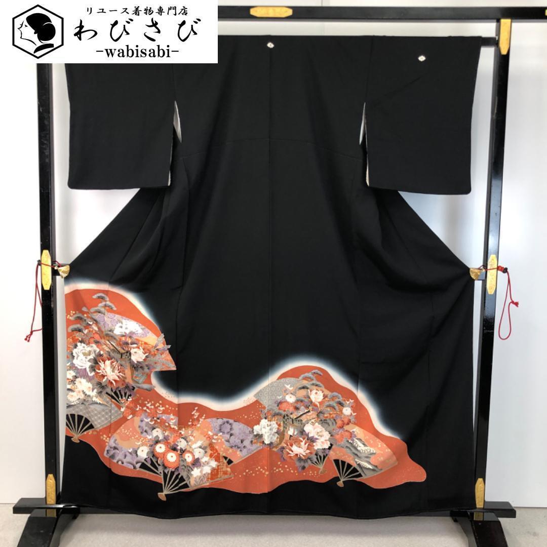 黒留袖 扇子に美しい花模様 七宝 花亀甲 金彩 K-4890 着物 きもの kimono 和服 和装 中古 リサイクル着物 【送料無料】