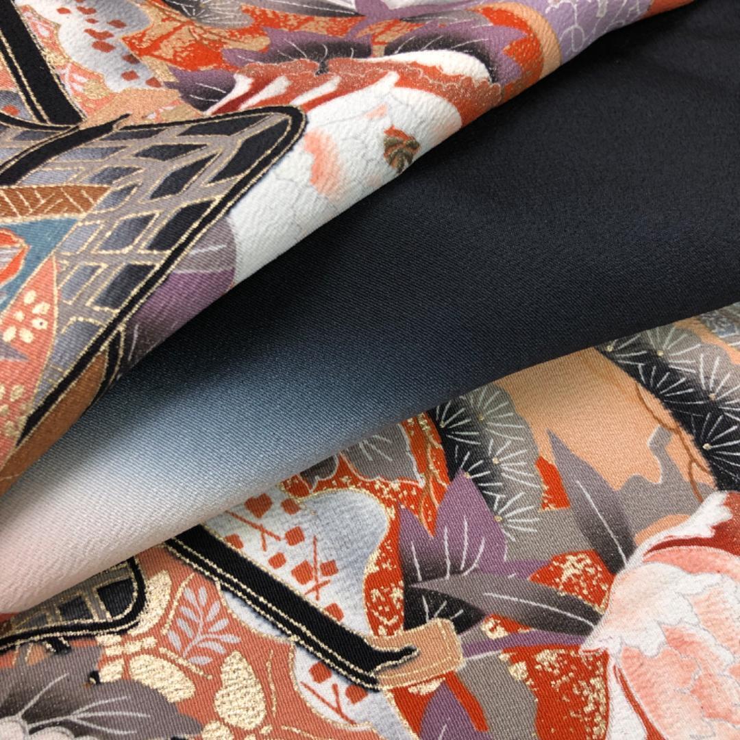 銀朱色のお色味に扇子に花模様、七宝、花亀甲などの金債が使われた色鮮やかな色彩の柄裄がデザインされた素敵なお品でございます。