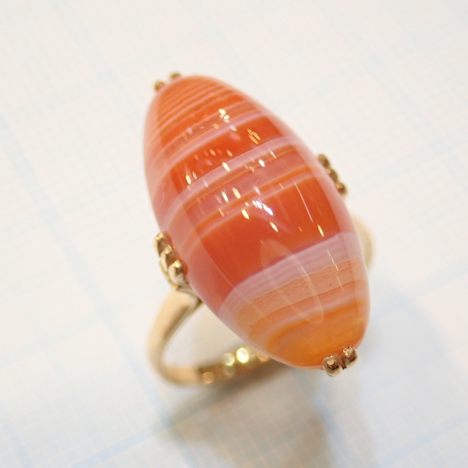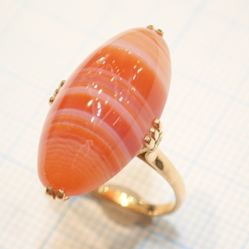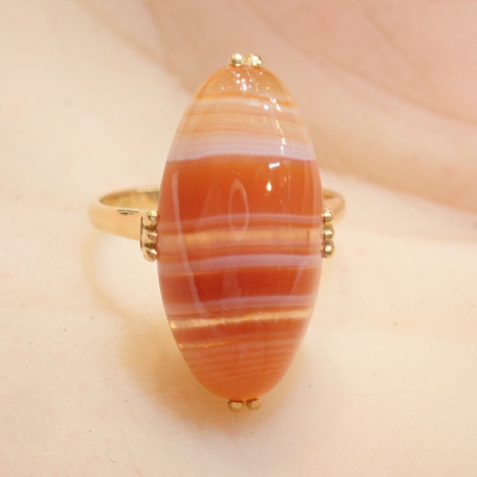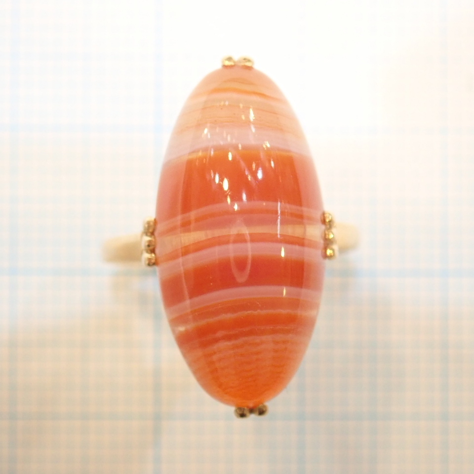 ■K18 縞瑪瑙リング■穴透かし 割り爪■めのう メノウ■アンティーク 昭和レトロ■指輪■中古磨 き仕上げ■