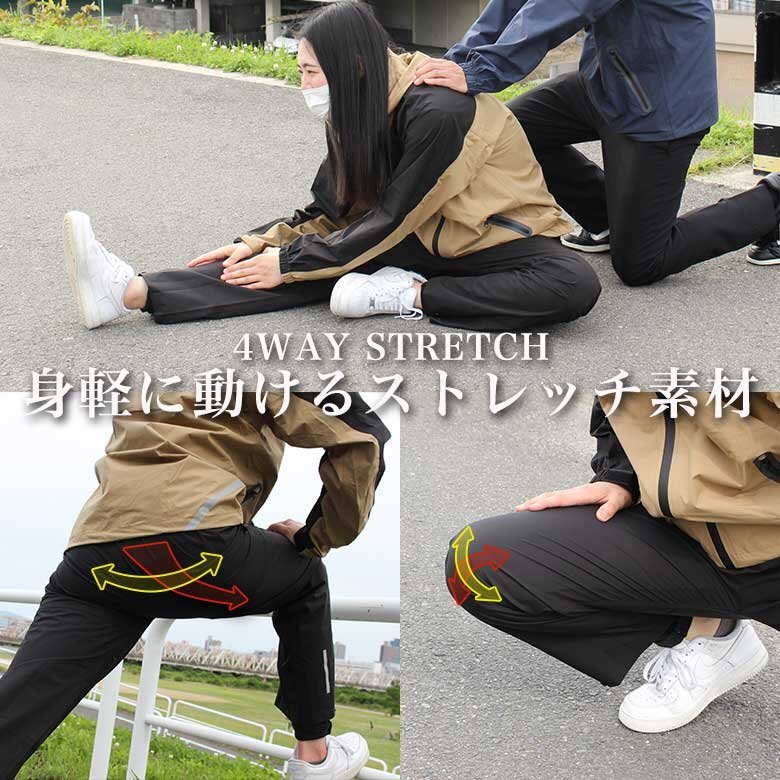 4方向(縦横)に伸びるストレッチ性の高い生地を使用!ストレッチ性・防水性・透湿性を兼ね揃えた最新レインスーツ。