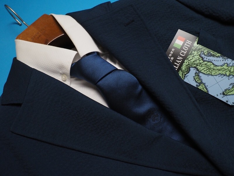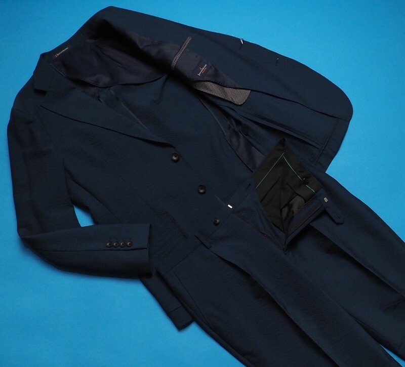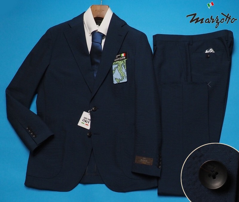 新品8.6万円 大手百貨店扱い 春夏『MARZOTTO マルゾット イタリア製生地』 シアサッカー 無地 セットアップ スーツA7青紺(F) 1636491