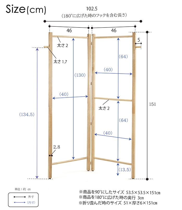 180°に広げた時のフックを含む商品サイズ:102.5×3×151?