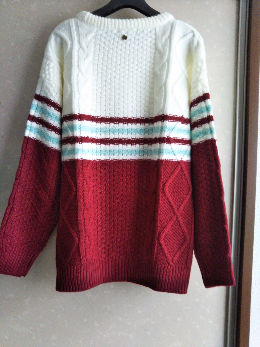 ふっくらな質感のケーブルニットにレトロな配色のボーダーを配したクルーネックセーター。